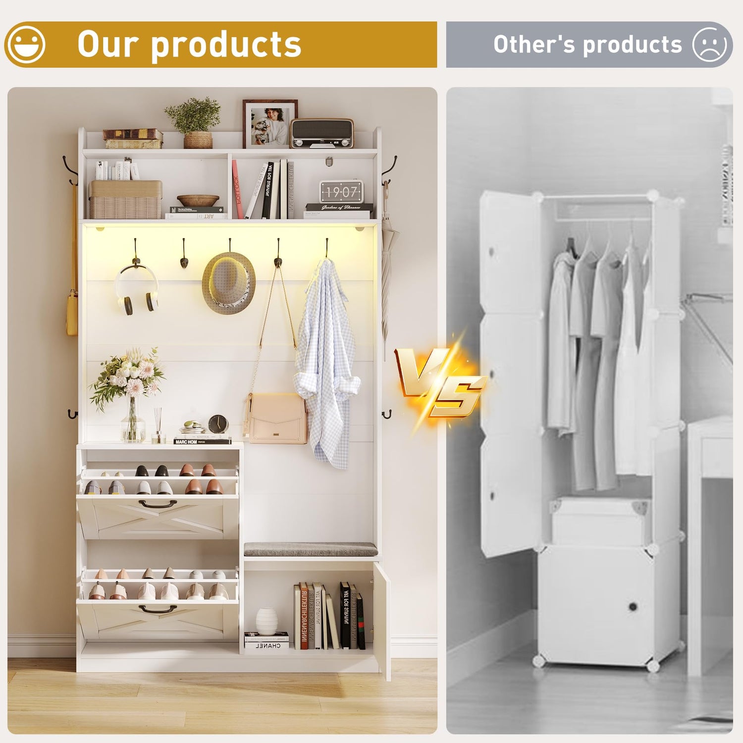- [5-in-1 Design] Rustic white farmhouse style design hall tree combines a coat rack, flip up shoe cabinet, shoe changing bench, entry door storage, and entryway lighting with a single piece of furniture to keep your entry just organized. You can sit on the stool with removable cushions to change into your comfy everyday shoes, hang your coat or bag on the hooks. With this versatile piece of furniture, you can fulfill a variety of storage needs without multiple items