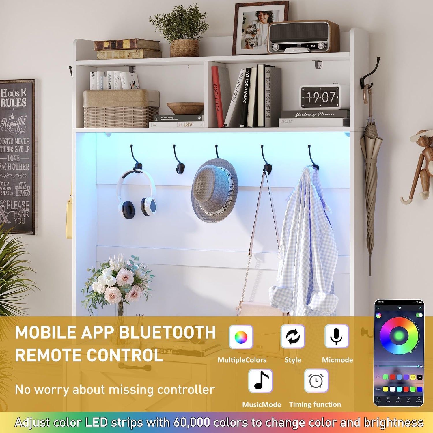 - [ Cool & Smart Led Light ] The hall tree comes with RGB LED light , remote control via APP, Over 60000 colors and 29 flashing modes for your to choose. Led lights with music sync function, which can change the brightness of the LED strip according to the rhythm of the music, so that you can enjoy a personal music party when you come back home!