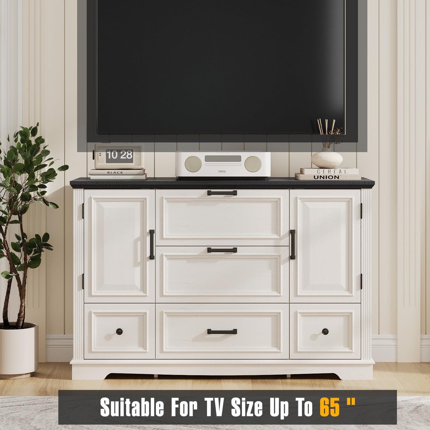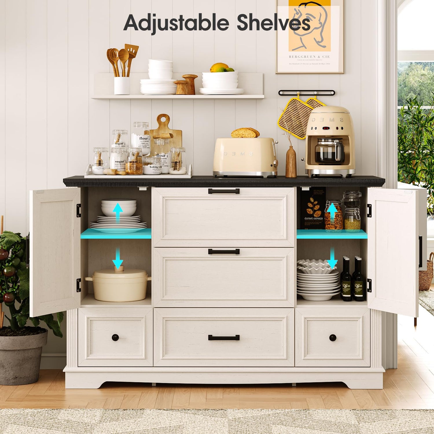 Maupvit Farmhouse 48" Buffet Cabinet with Storage,Coffee Bar Cabinet for Kitchen,Living Room,Wood Rustic Sideboard Cabinet w/5 Drawers&2 Grooved Doors,White