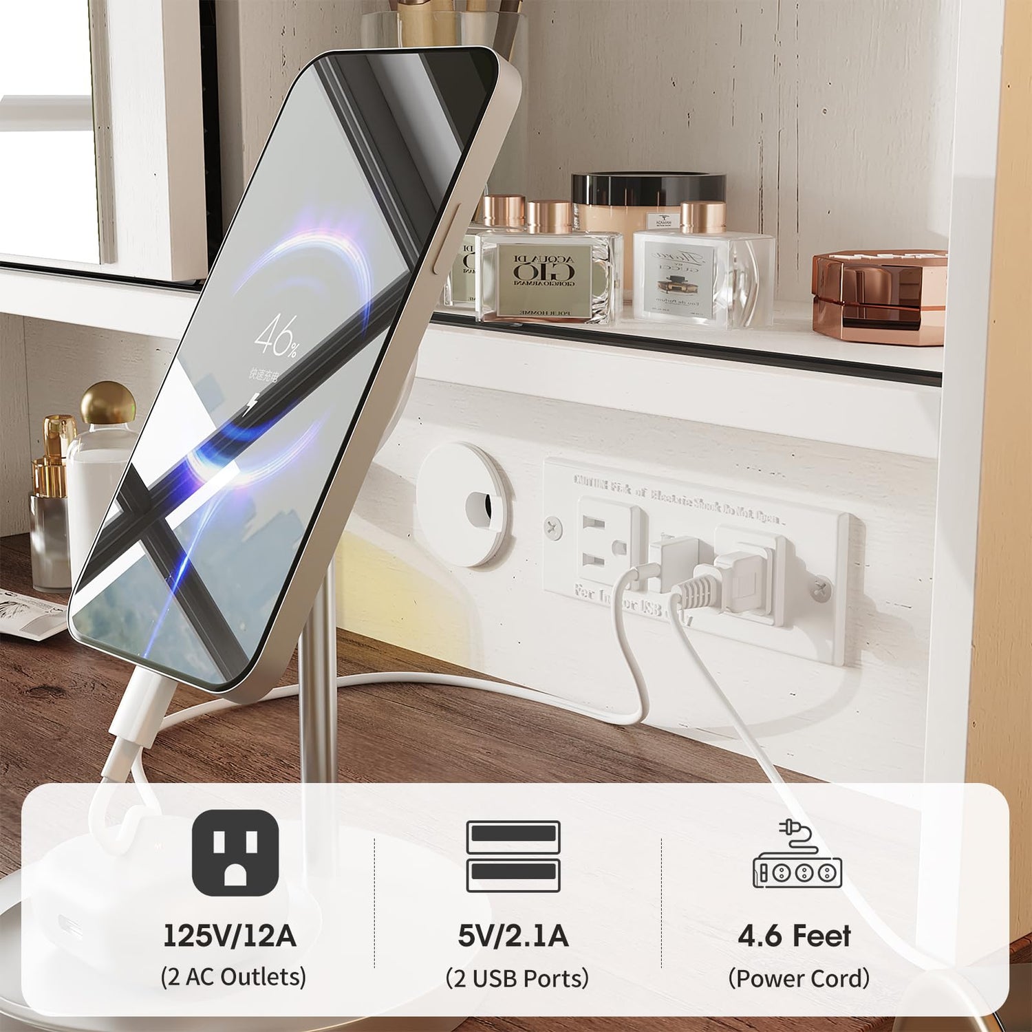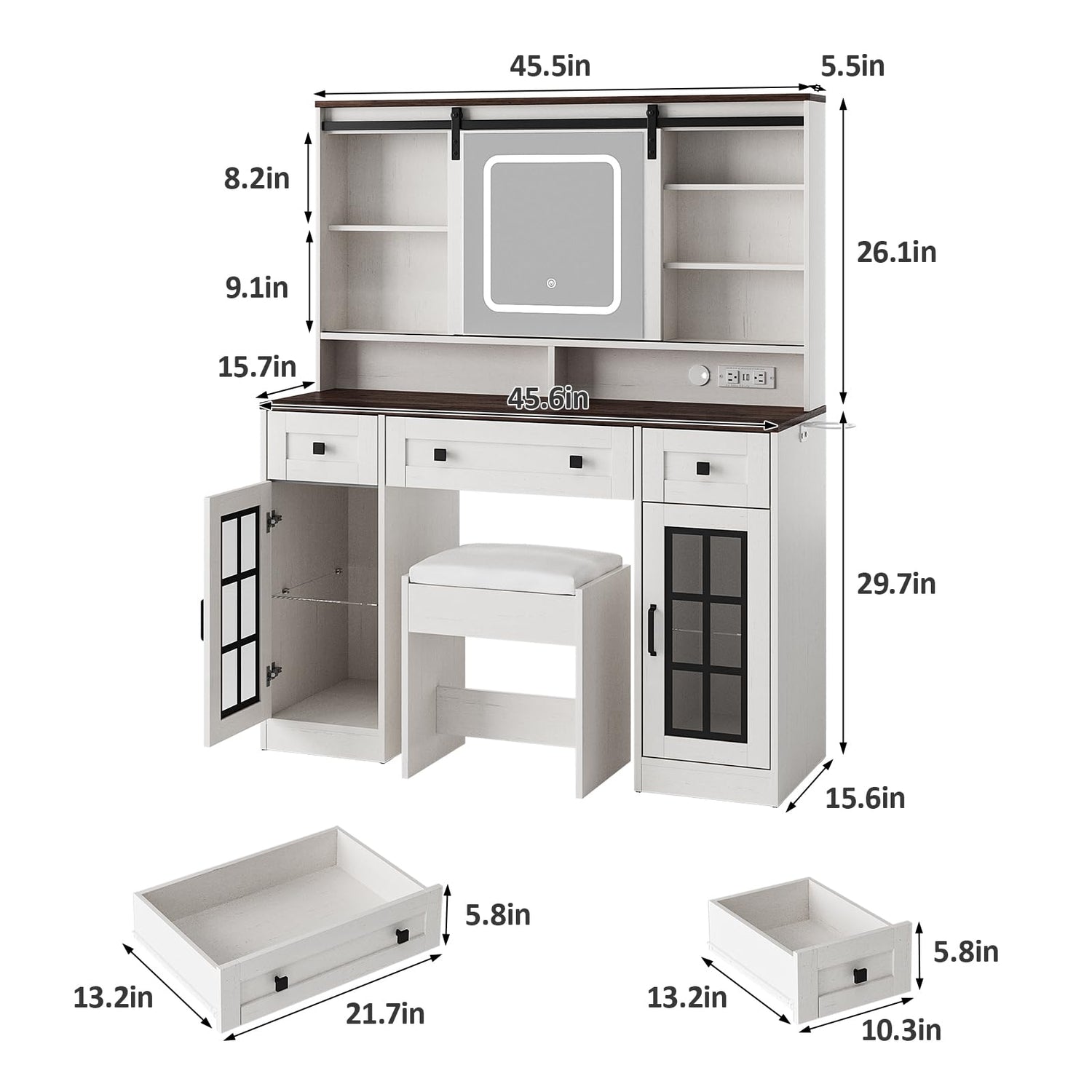- 【Vanity Set with Charging Station 】The farmhouse vanity comes with a makeup table and a PU upholstered stool and a hair dryer holder. With upgraded design - built-in charging station, including 2 standard sockets and 2 USB ports, let you sit more comfortably at the vanity table for makeup, skincare and hairdressing.