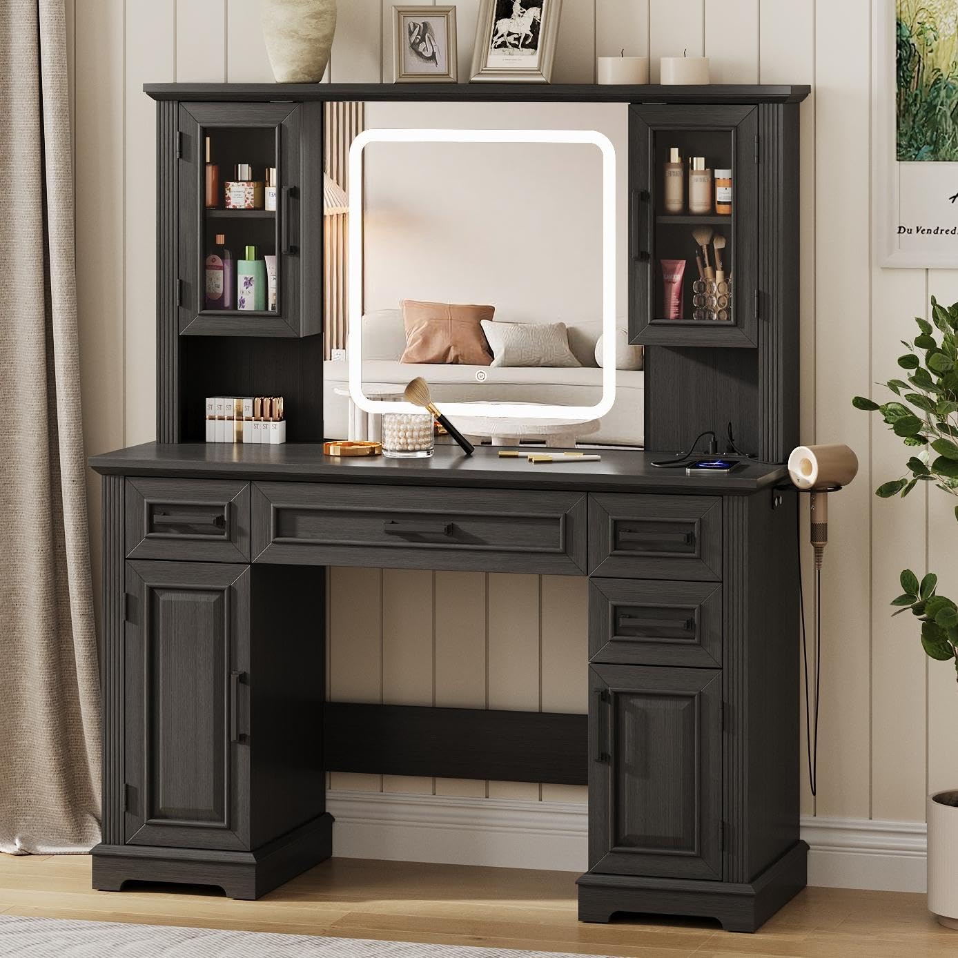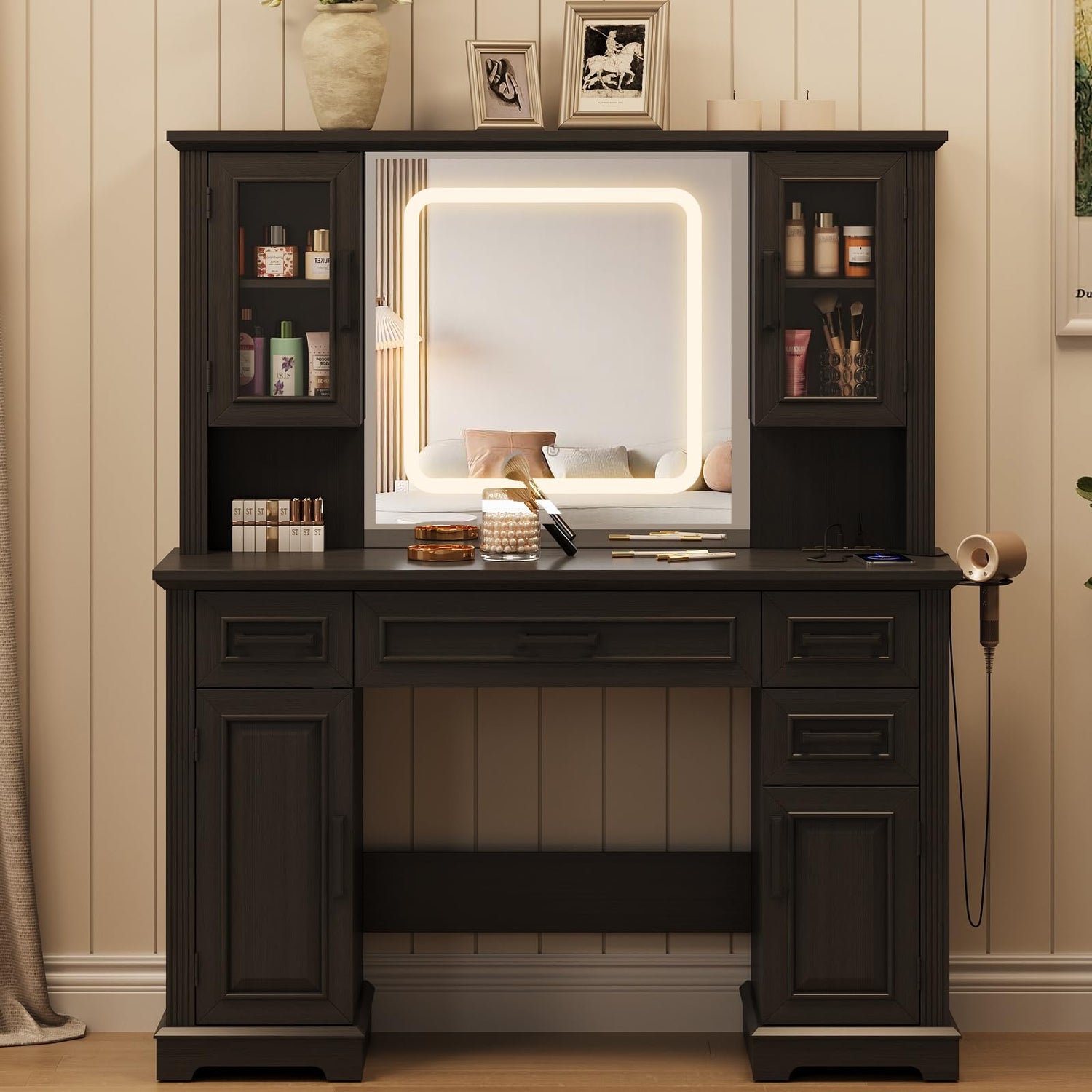 Maupvit Farmhouse Vanity Desk with Mirror and Lights, Makeup Vanity Table with Charging Station, 45" Bedroom Table with 4 Drawers and Cabinets, 3 Lighting Modes, Black