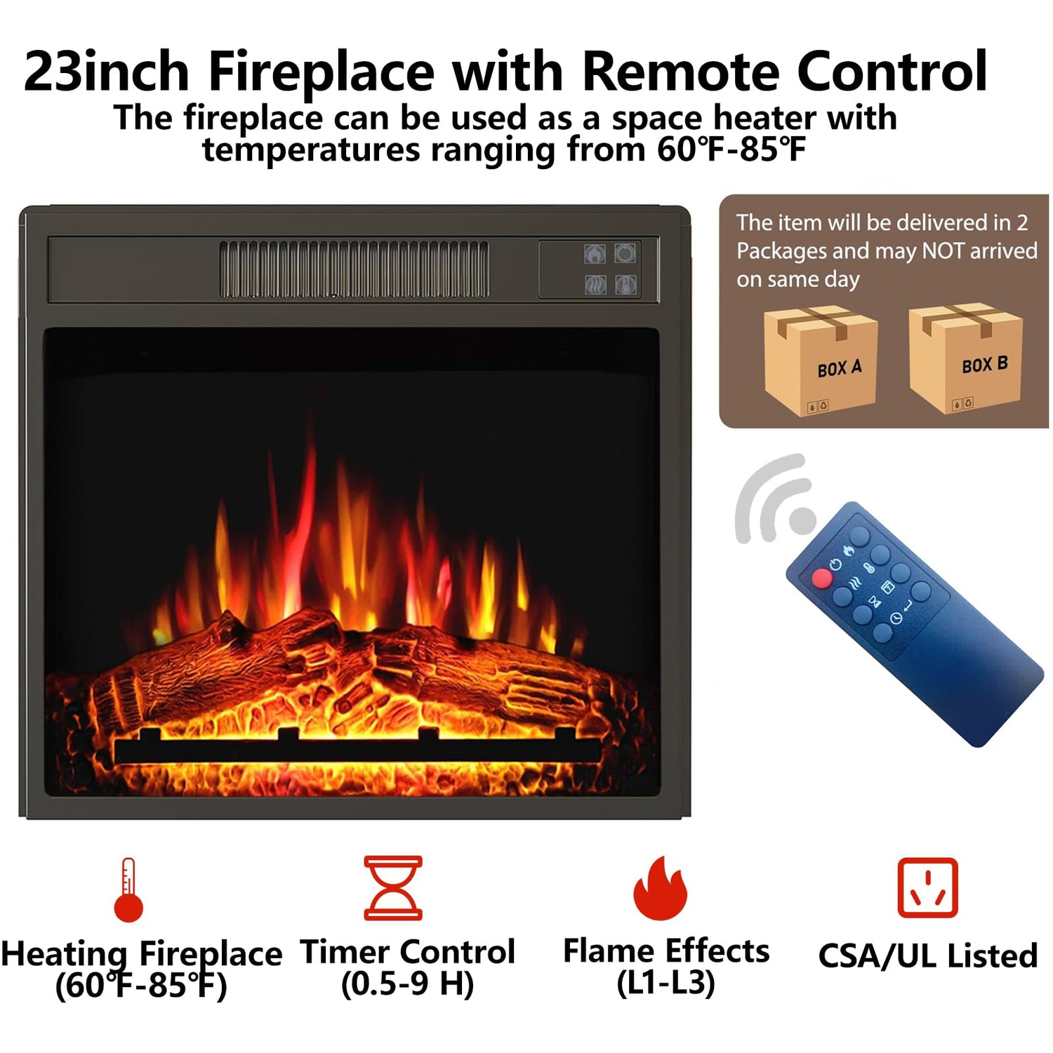 - 23Inch Electric Fireplace: The farmhouse tv stand with fireplace is an ideal choice for 400 SQ. FT. spaces. maintaining the temperature between 60°F to 82°F. Featuring realistic 3D flame effects, Choose from 3 flame effects with 3-speed flame and heating adjustments.The fireplace tv stand featus a clever timer that turns off automatically in 0.5-9 hours. The farmhouse entertainment center with fireplace adding a touch of warmth and elegance to decorate your room.