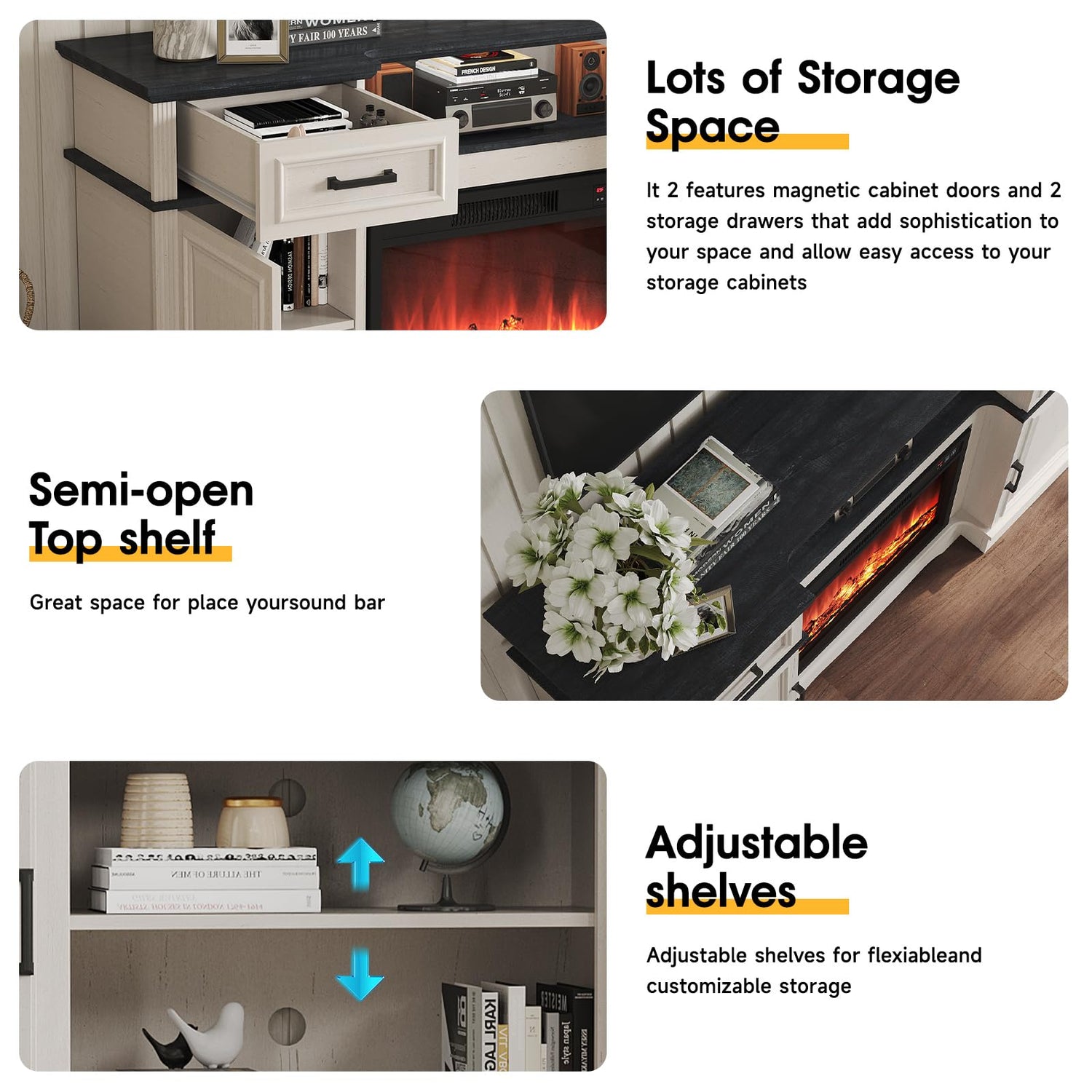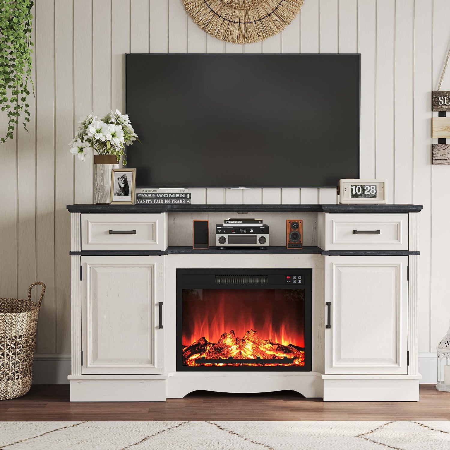 - 23Inch Electric Fireplace: The farmhouse tv stand with fireplace is an ideal choice for 400 SQ. FT. spaces. maintaining the temperature between 60°F to 82°F. Featuring realistic 3D flame effects, Choose from 3 flame effects with 3-speed flame and heating adjustments.The fireplace tv stand featus a clever timer that turns off automatically in 0.5-9 hours. The farmhouse entertainment center with fireplace adding a touch of warmth and elegance to decorate your room.
