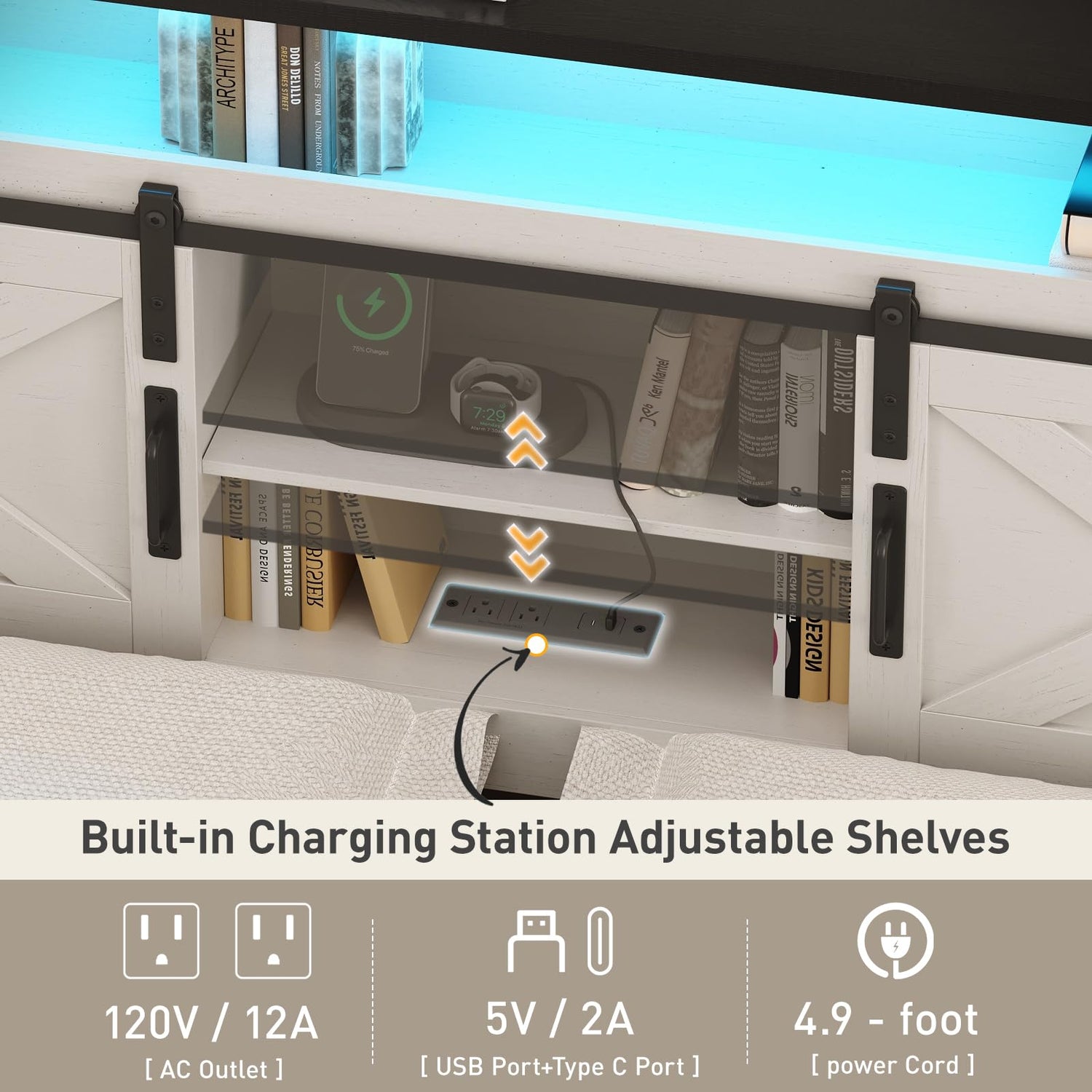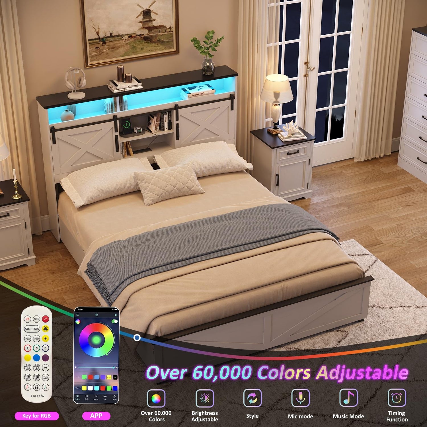 Maupvit Full Size Farmhouse Bed Frame with 4 Drawers and Sliding Barn Door, Storage Shelves, LED Light and Charging Station Metal Platform Bed Frame No Box Spring Needed, White