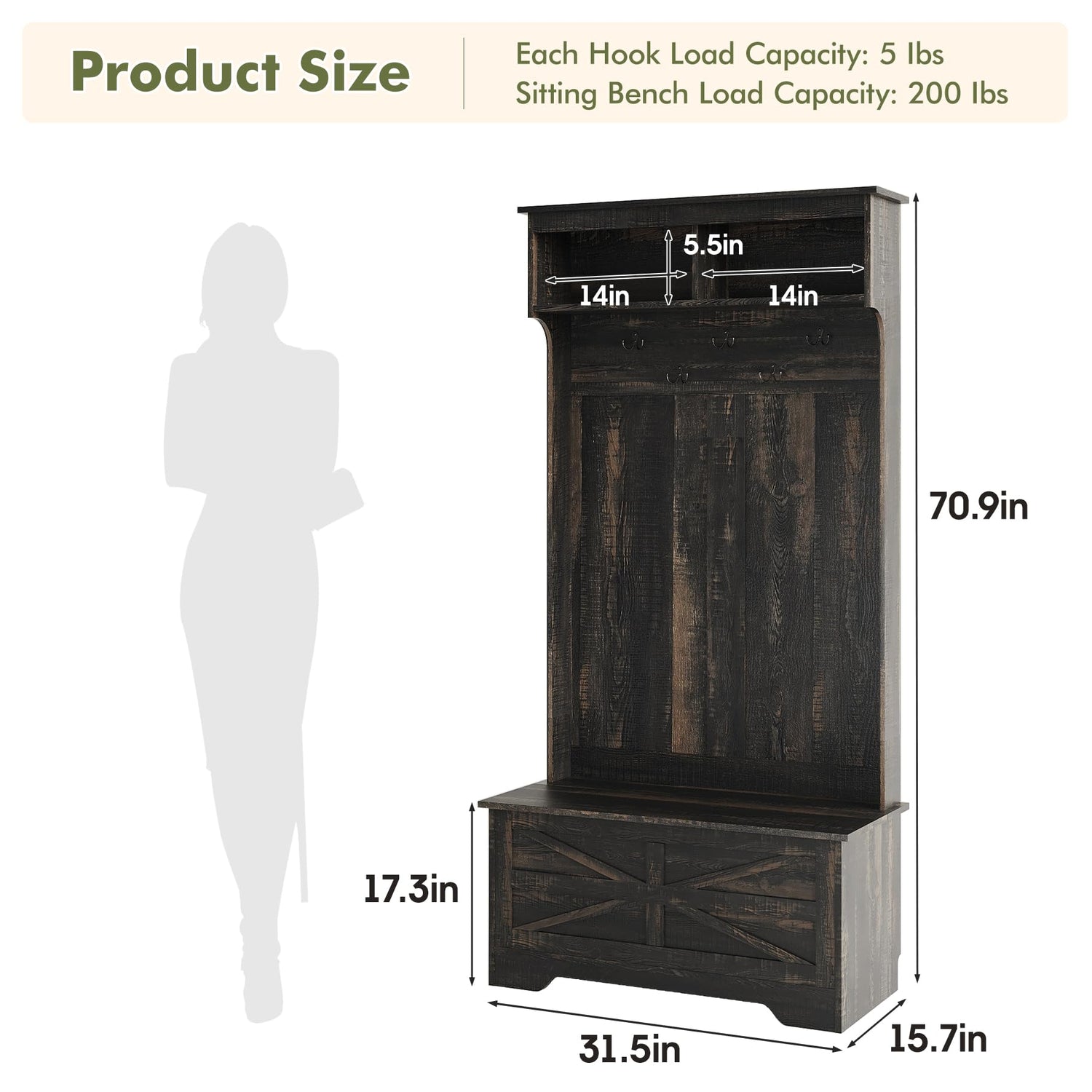 - [4-in-1 Hall Tree with Bench]: 32 inch Wide tree hall it features 5 hooks, a comfy bench, a enclosed cabinet, and a top shelf for extra storage.The wide storage bench doubles as a seat for changing shoes on your commute and holds up to 200 lbs. Metal hooks are painted to prevent rust. Smooth surface is easy to clean and can be wiped down with a clean, damp cloth for longer life