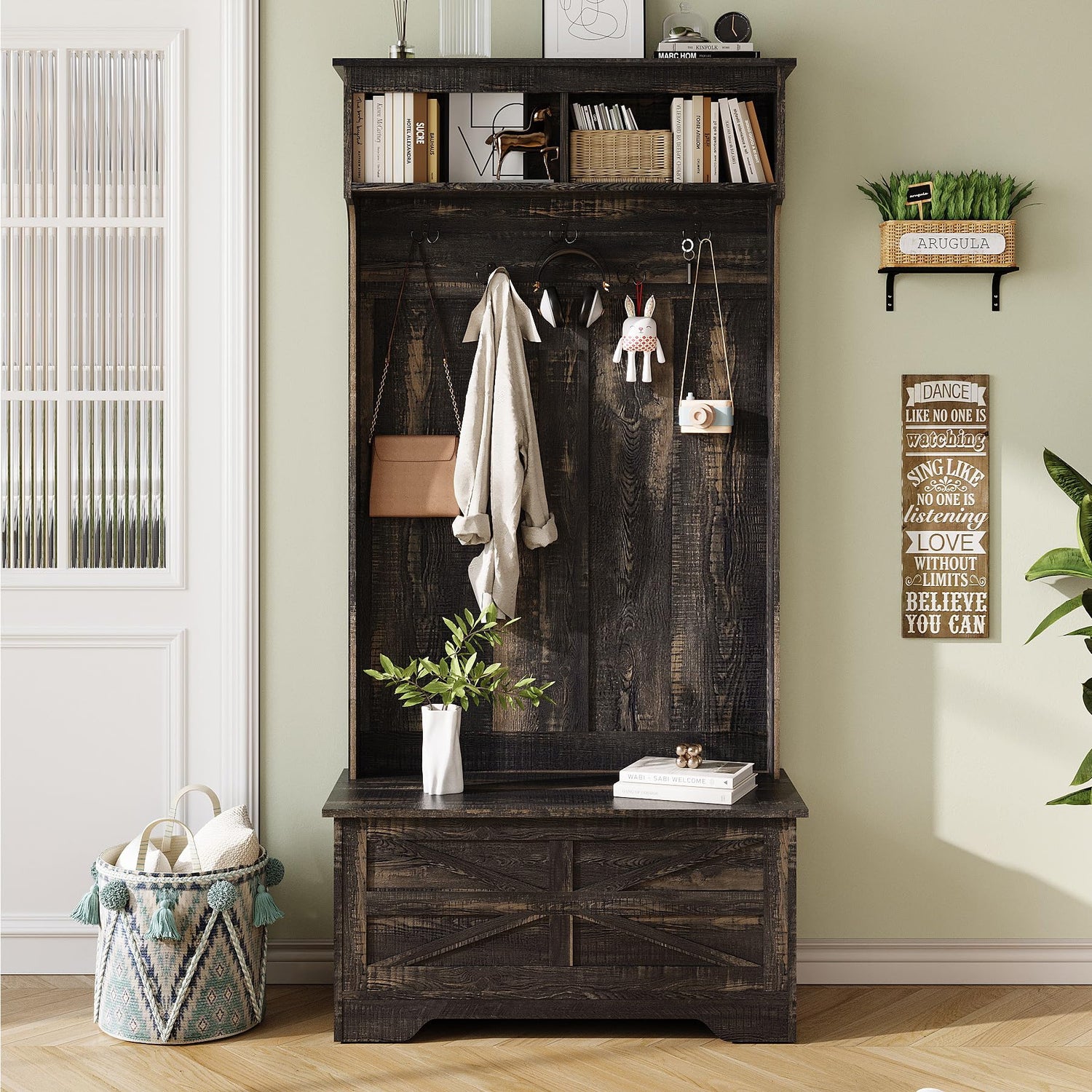 - [Versatile Storage Solutions]: This multifunctional hall tree is designed to meet your various needs. The top dividers provide a place for displaying potted plants, photo albums, or other decorations, while the 5 hooks offer convenient storage for hats, pet leash and bags. Additionally, the bottom flap storage cabinet provides ample space for organizing your belongings