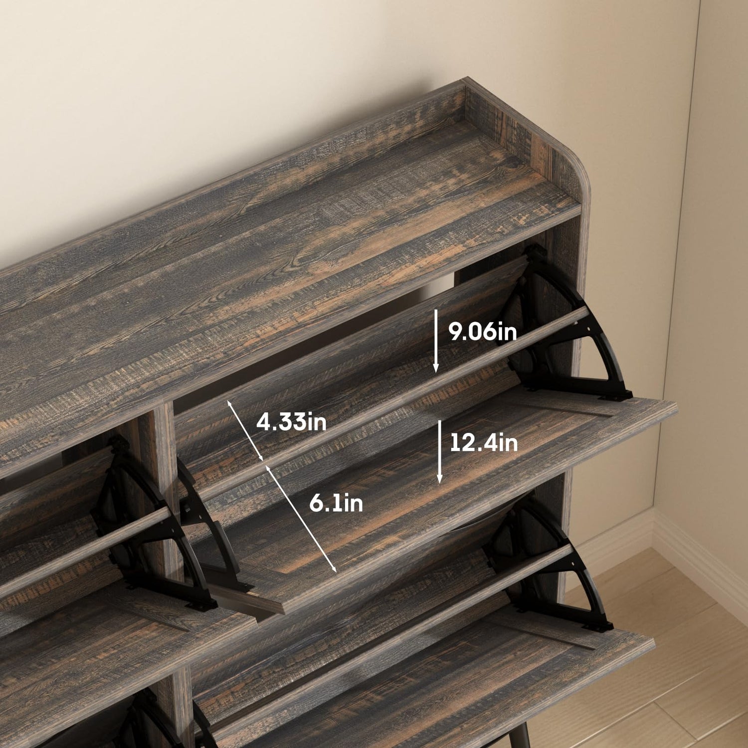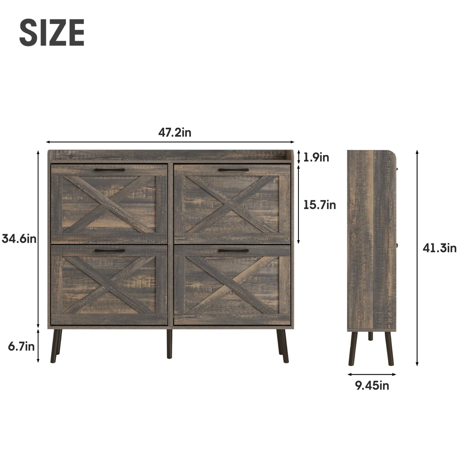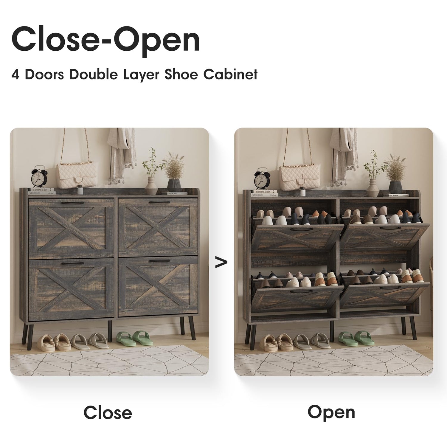 - 【Entryway Shoe Cabinet】: The hidden shoe storage cabinet with 4 flip doors, stylish and simple dark rustic oak makes it a neat and beautiful finish and looks great in many different home styles. Perfect for placing in the entryway, hallway, living room, or porch, provides a neat looking in your home and space saving.