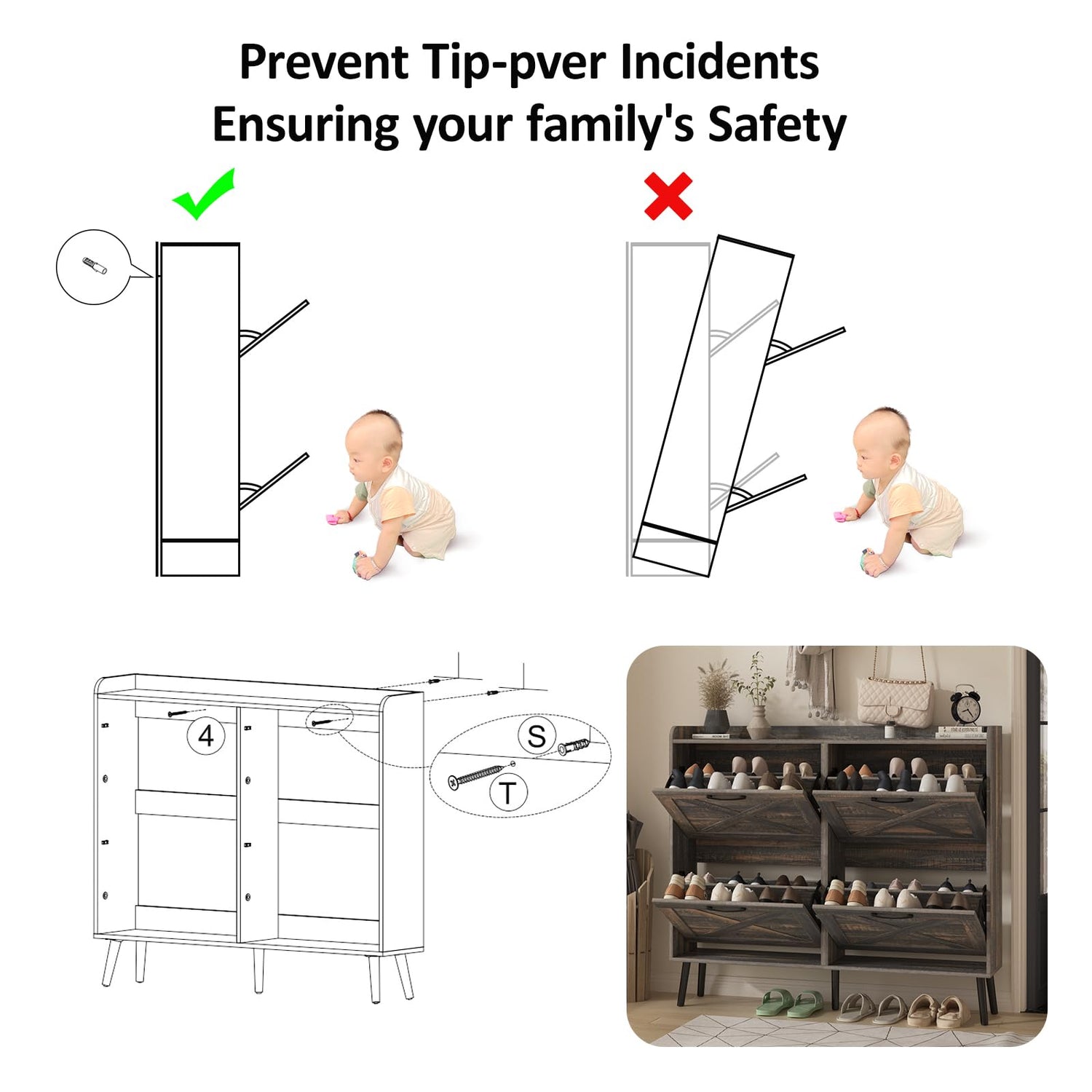 - 【Safe and Reliable Quality】: This slim shoe cabinet contains an anti-tipping device, which can be fixed on the wall to prevent tipping and protect children's safety. Made of high-quality MDF wood and wood legs, the stable structure ensures super load-bearing capacity. The black metal handle is simple and elegant, feels comfortable, and prevents scratches and injuries during use. 5 Sturdy wooden legs prevent the floor from being scratched, and can be easily cleaned with a damp cloth.