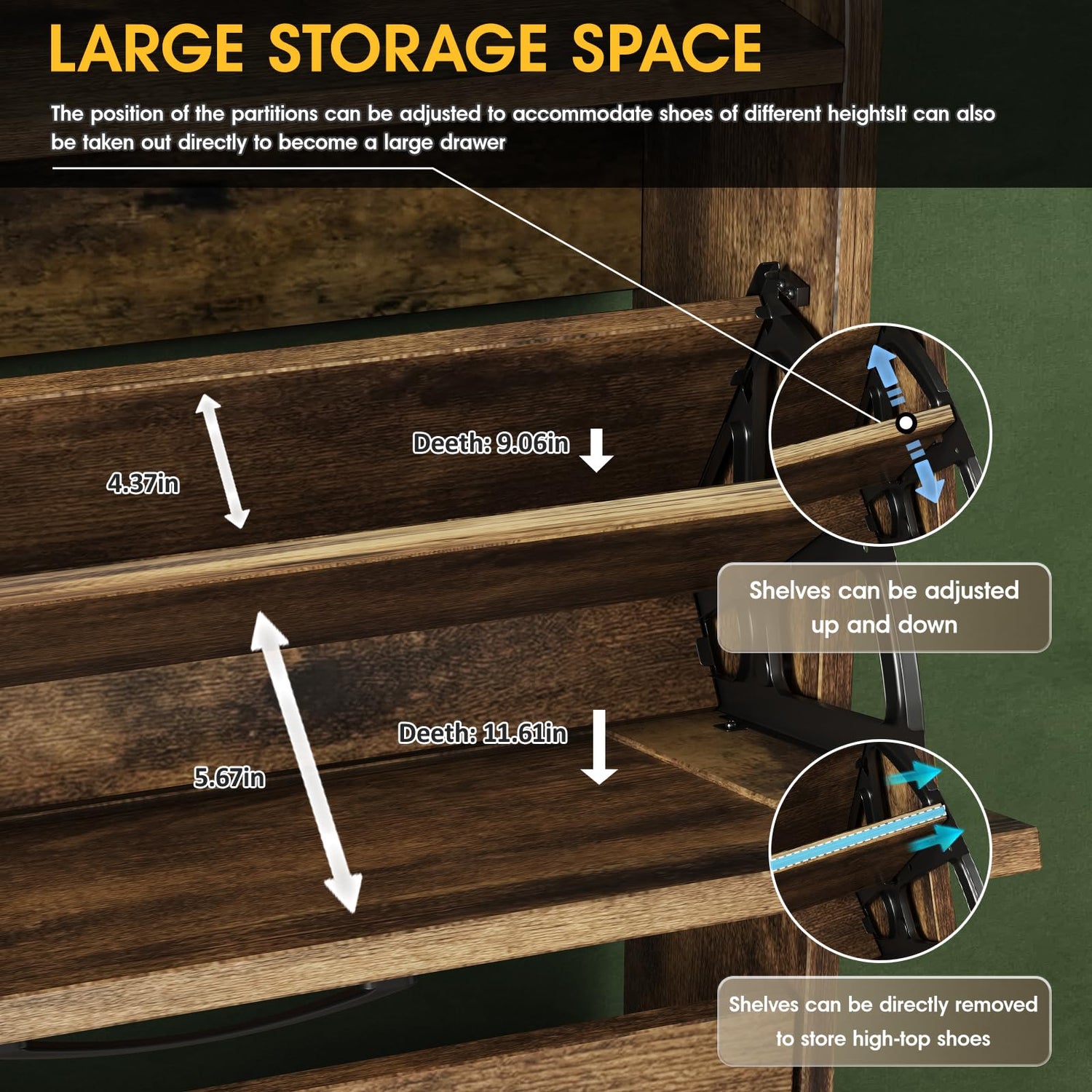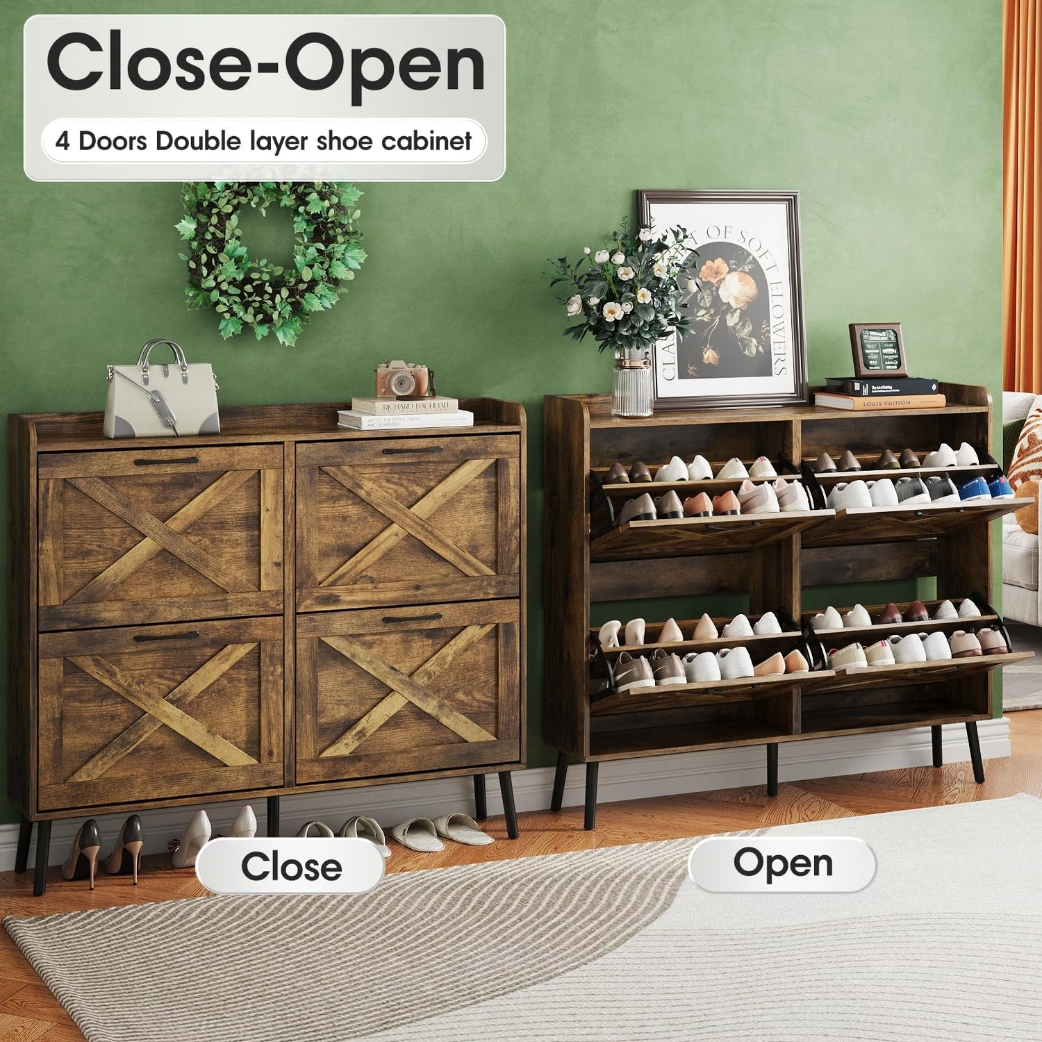 - Entryway Shoe Cabinet: The hidden shoe storage cabinet with 4 flip doors, stylish and simple rustic brown makes it a neat and beautiful finish and looks great in many different home styles. Perfect for placing in the entryway, hallway, living room, or porch, provides a neat looking in your home and space saving
