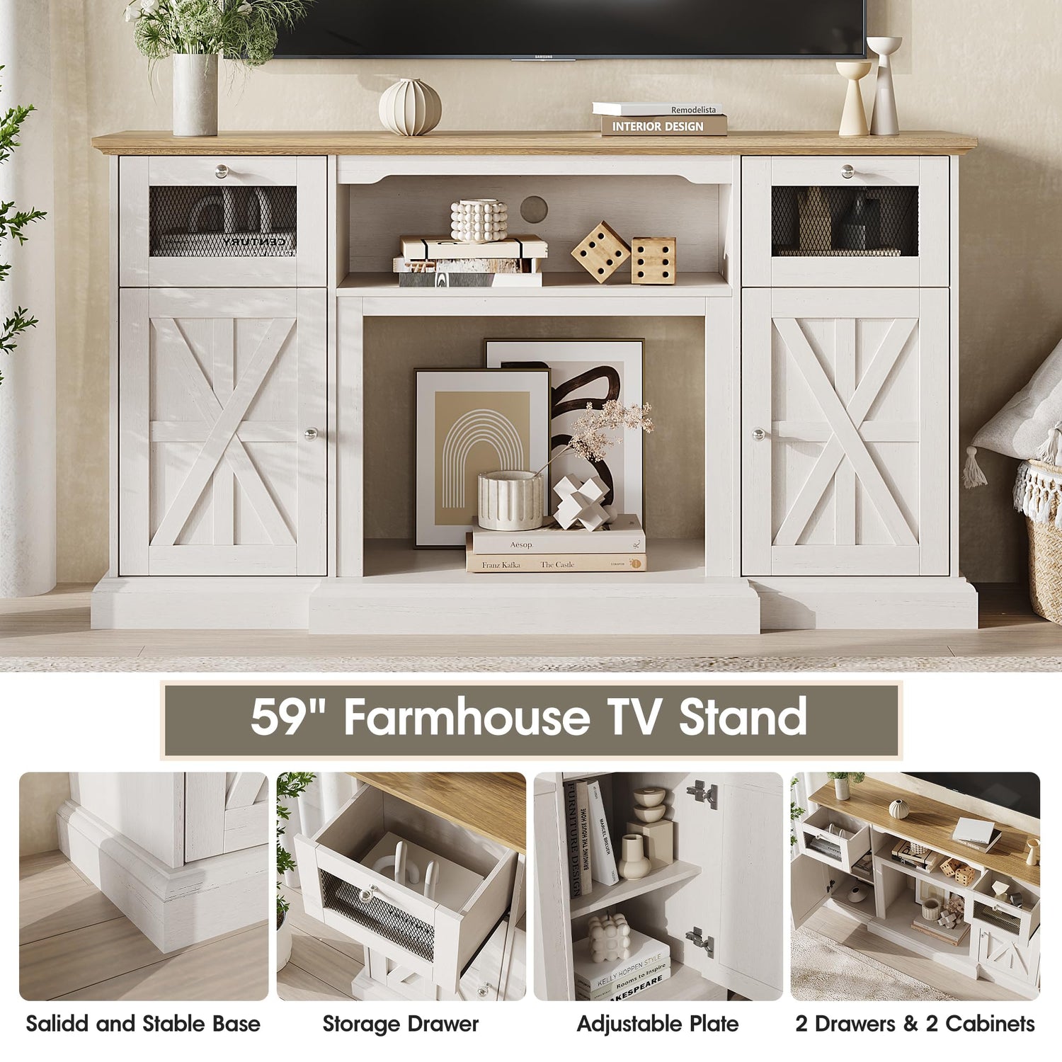 - Rugged Construction: The farmhouse entertainment center is made of finely crafted solid wood with unique and exquisite wood grain, strong stability and toughness, not easily deformed, and strong weight-bearing capacity. This TV cabinet measures 15.2 “D x 59 ‘W x 32.7 ’H, suitable for 50/ 55/ 60/ 65-inch TV sets, very convenient