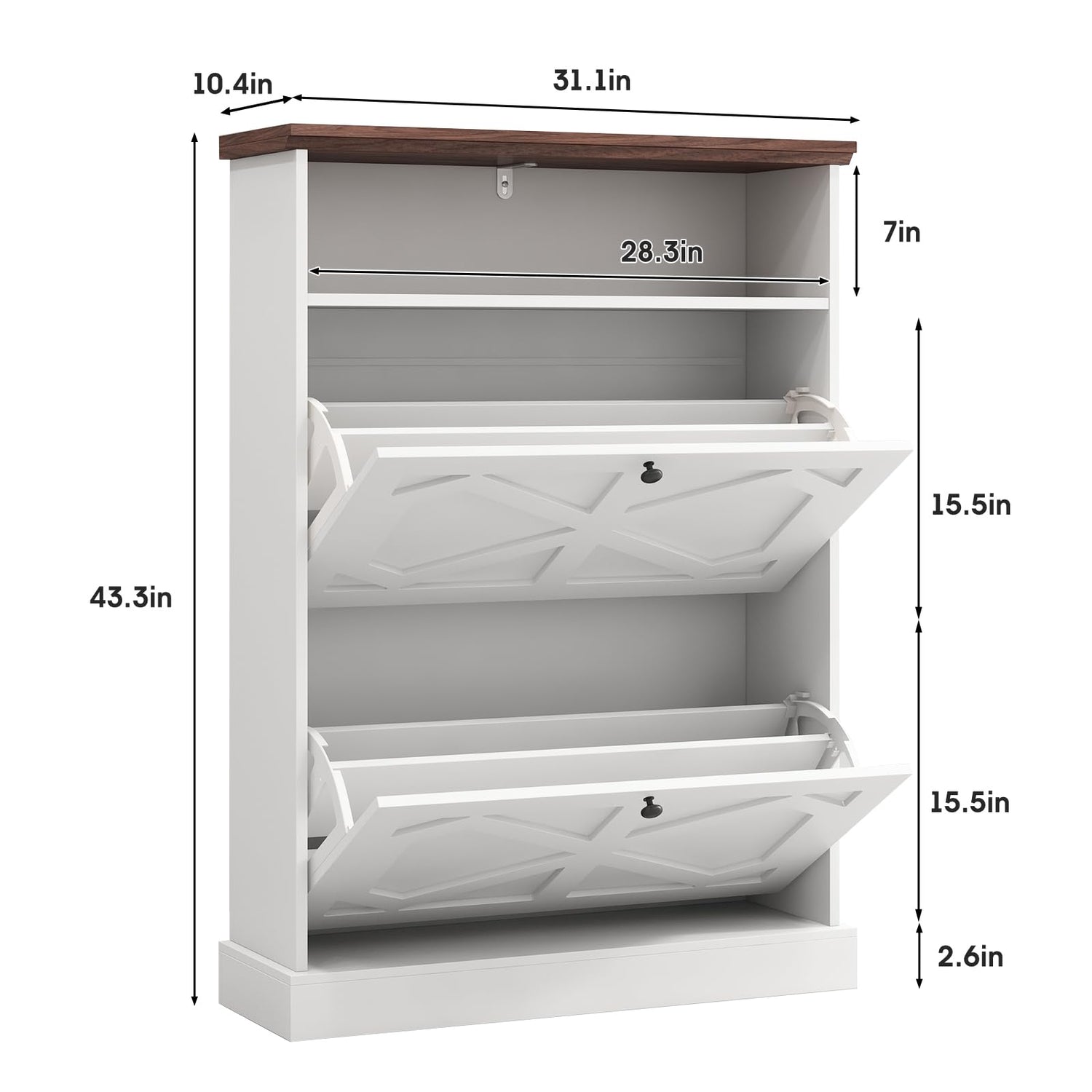 Maupvit Shoe Cabinet with 2 Flip Drawers, Shoe Storage Cabinet for Entryway, Freestanding Shoe Organizer with Open Storage, Farmhouse Narrow Shoe Rack with Wooden Legs for Foyer, Hallway,Antique White