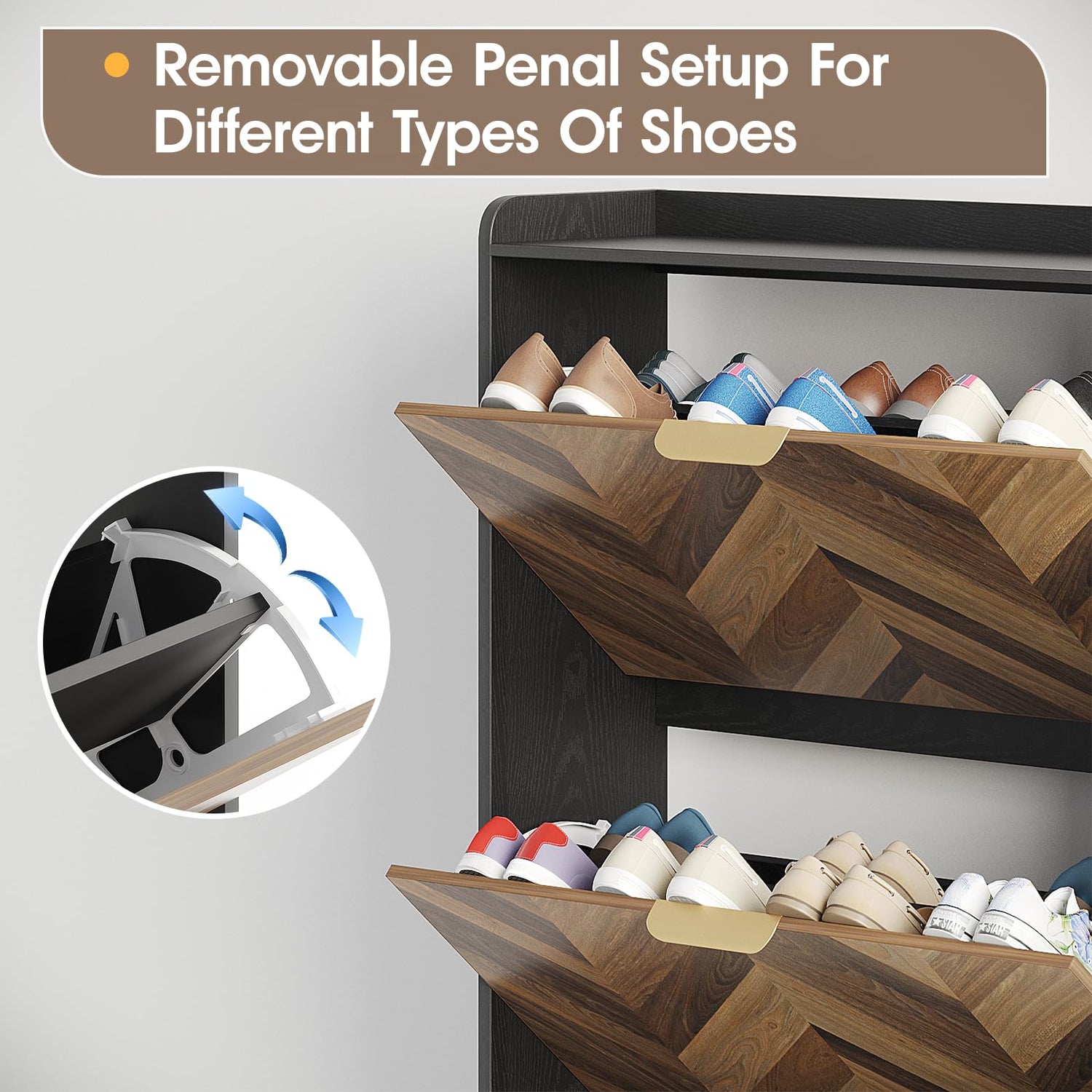 - 【Flip Drawers Shoe Cabinet】Our drawers shoe cabinet has two flip drawers and 3 tiers inside each drawer,It features a removable divider in each compartment, you can choose to keep or remove the panel according to the size or style of your shoes
