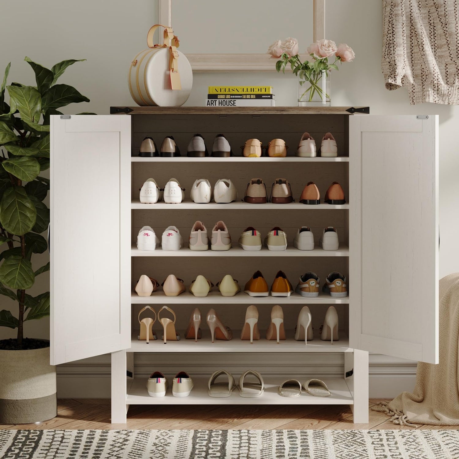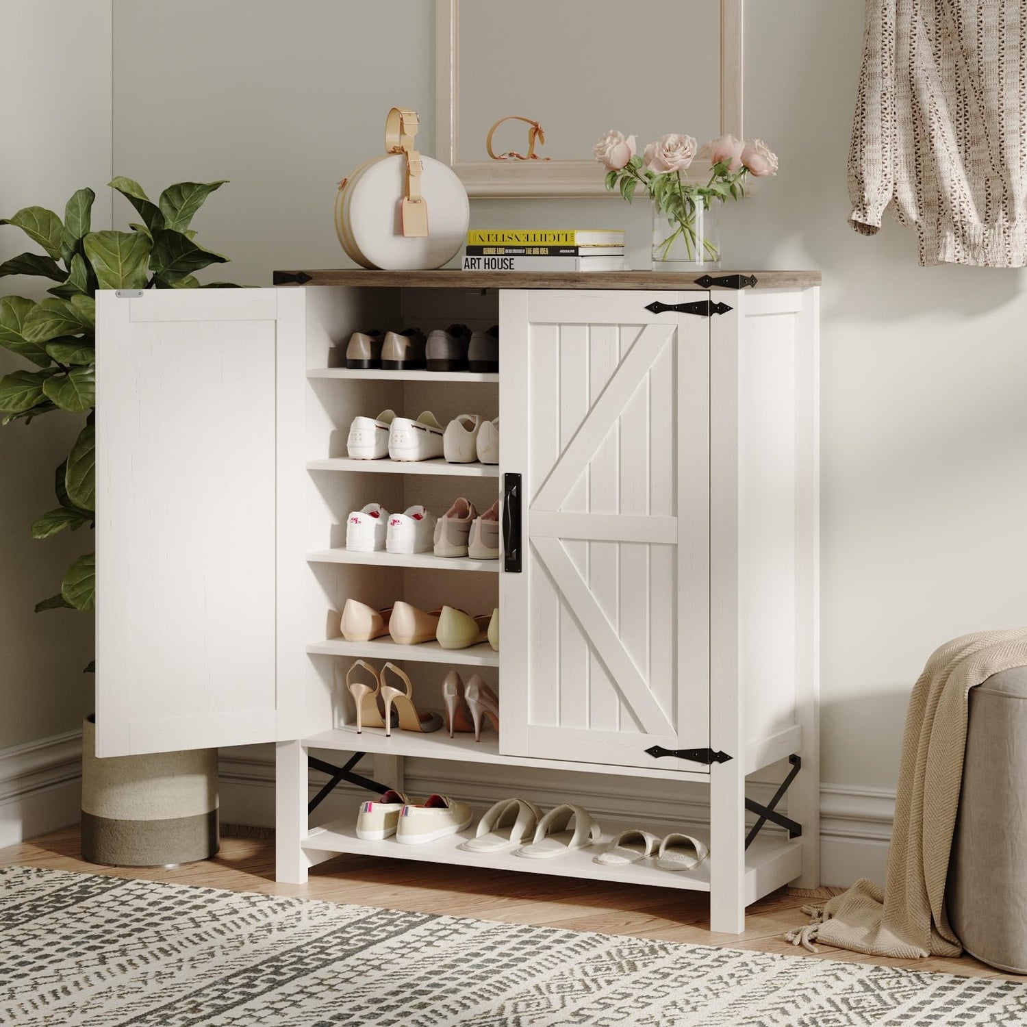 Maupvit Shoe Cabinet with Doors, 6-Tier Farmhouse Shoe Storage Cabinet with Adjustable Shelves, Shoe Shelf, Wooden Shoe Rack Organizer Cabinet for Entryway, Foyer, Hallway, Living Room, White