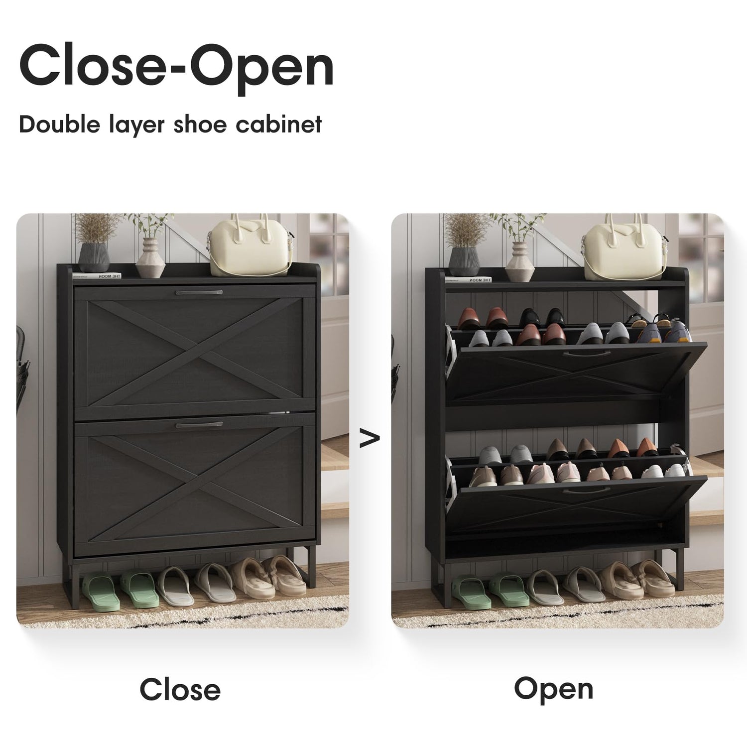 - Entryway Shoe Cabinet: The hidden shoe storage cabinet with 2 flip doors, stylish and simple black makes it a neat and beautiful finish and looks great in many different home styles. Perfect for placing in the entryway, hallway, living room, or porch, provides a neat looking in your home and space saving