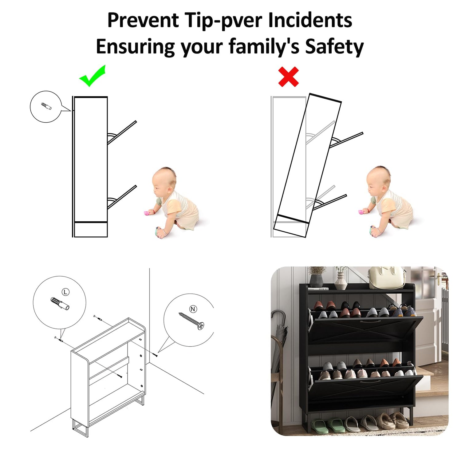 - Safe and Reliable Quality: This slim shoe cabinet contains an anti-tipping device, which can be fixed on the wall to prevent tipping and protect children's safety. Made of high-quality MDF wood and metal legs, the stable structure ensures super load-bearing capacity. The black metal handle is simple and elegant, feels comfortable, and prevents scratches and injuries during use. The black metal legs prevent the floor from being scratched, and can be easily cleaned with a damp cloth