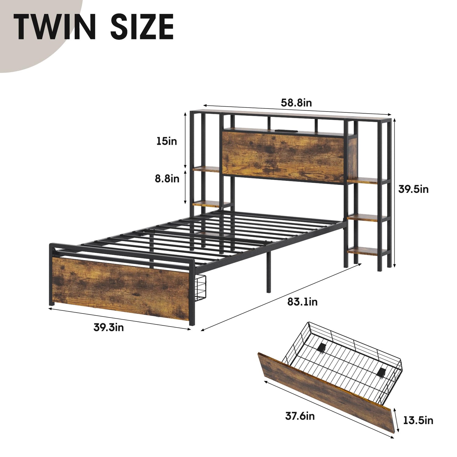 - đăUtility Bookshelf and Storage HeadboardăMaupvit Twin Size Metal Platform Bed Frame with bookshelf storage compartments on the headboard and 3 tiers of storage shelves on each side, which is equivalent to a bedside table, keeping your cell phone, glasses, books, coffee mugs, chargers, etc. within reach. And provides an extra place for decorations, photo frames or other items you want to display.