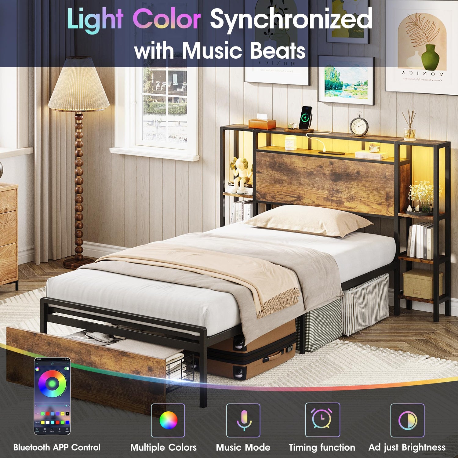 - đăCharging Station and LED LightăMaupvit Twin Size led bed frame with 2 standard outlets, 1 USB port and 1 Type C port is very convenient for you to charge your phone/tablet or read easily with a desk lamp while lying on your king size bed, making your life more comfortable and convenient. This bed frame headboard platform bed frame with vibrant multi-color smart RGB LED strips can be controlled by app or controller to create your favorite bedroom atmosphere.