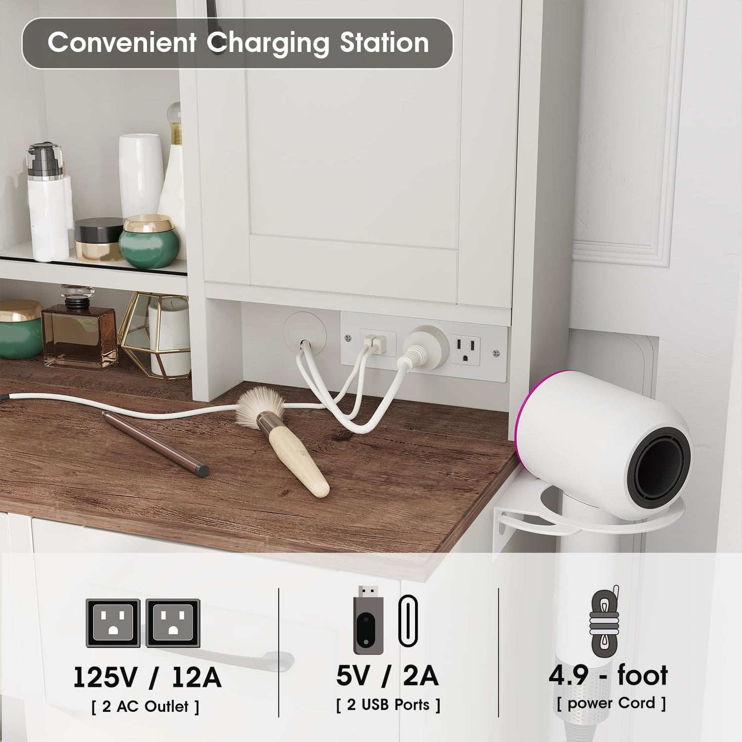 - Built-in charging station: The makeup vanity mirror with lights tale is equipped with 2 standard sockets and 2 USB ports, allowing you to easily use your hairdryer and curling iron while applying make-up and charge other beauty power devices in front of the mirror, the bedroom vanity with drawers for the dressing room, salon or living room