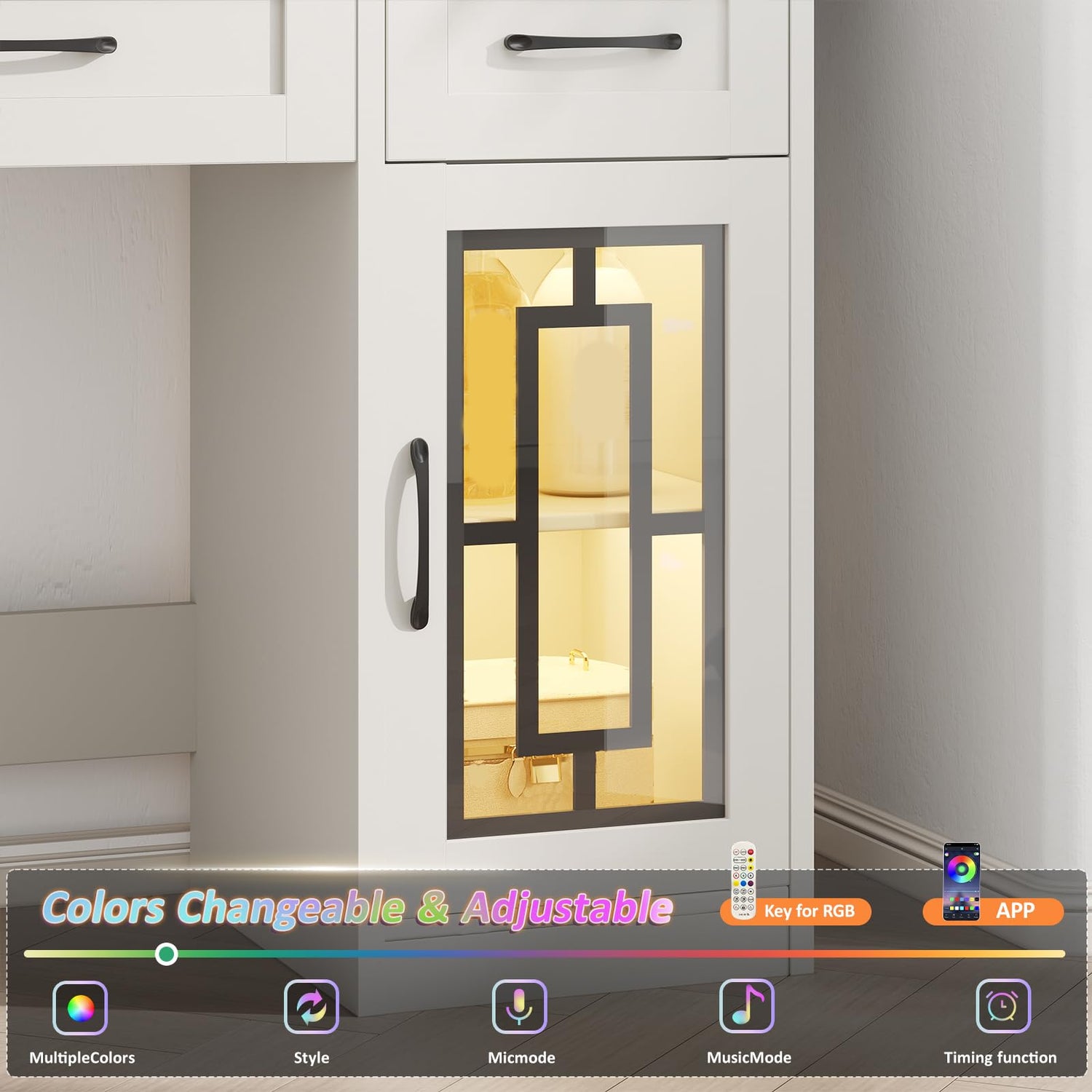 - Sturdy yet stylish: The makeup vanity has a side cabinet door with jewellery storage, 72 ring slots and 12 hooks to keep rings, earrings, necklaces and other jewellery organised; the makeup vanity with jewelry storage has a cabinet with glass doors and RGB LED lights to add more ambience to the room