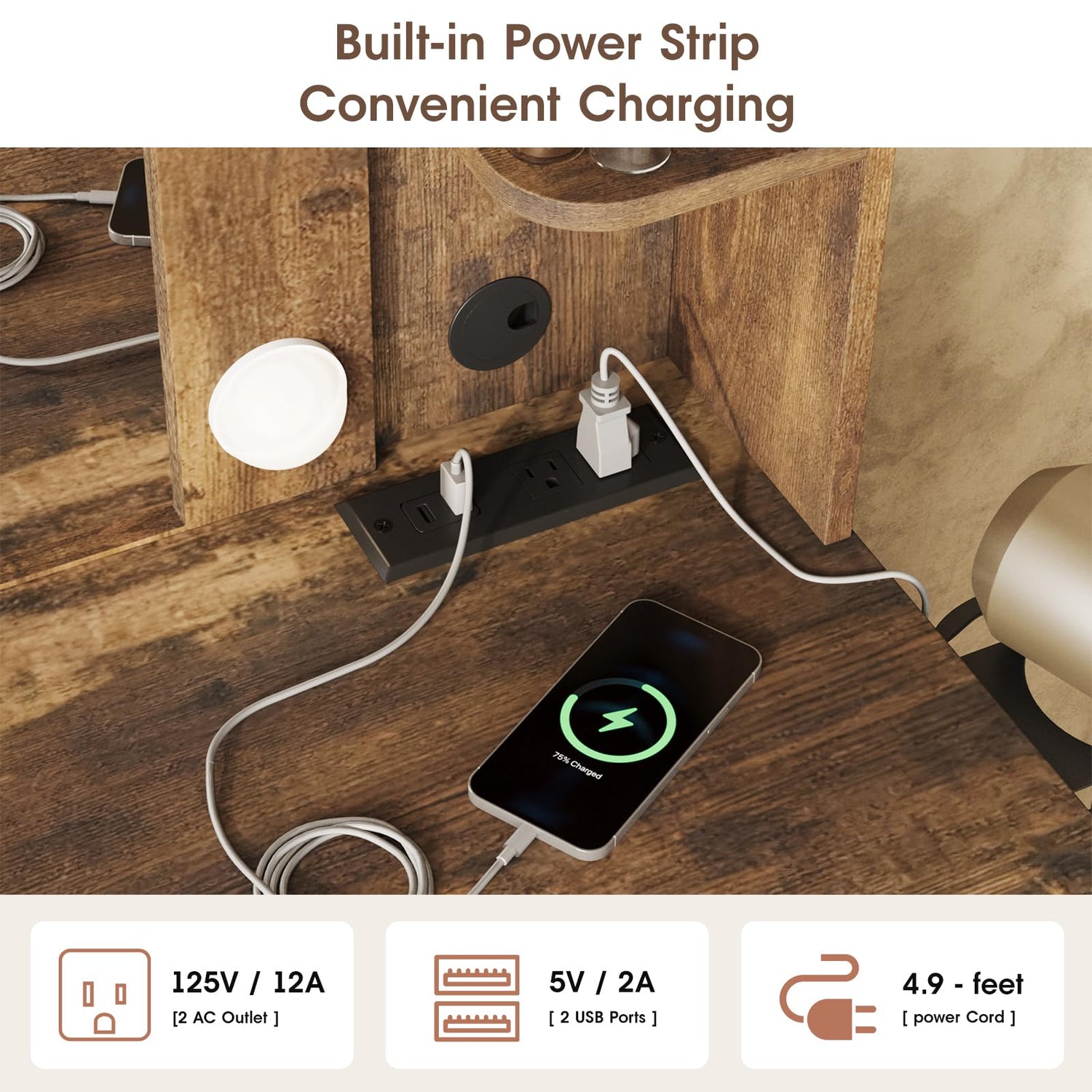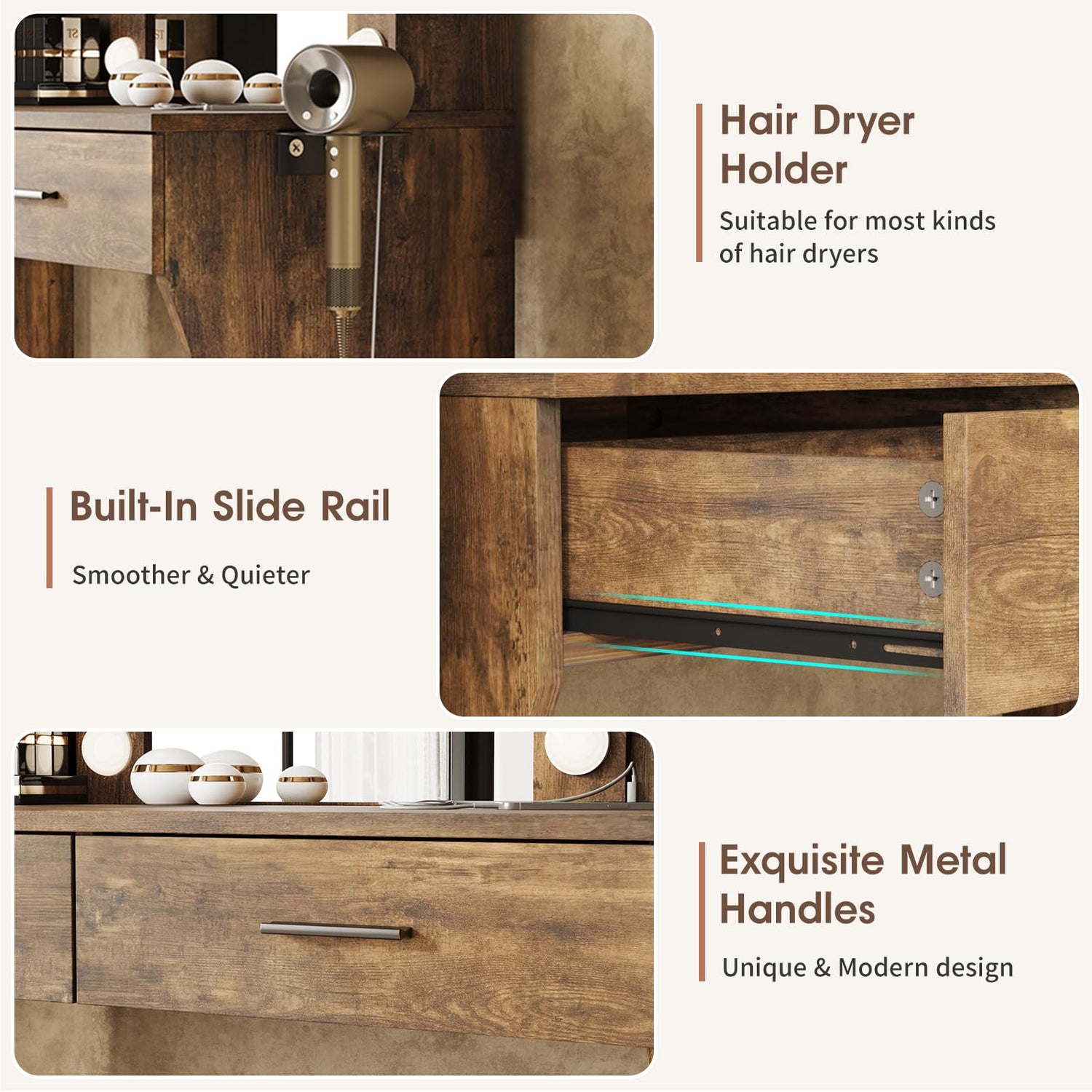 - 【Makeup Desk with Charging Station】This vanity with lights has a embedded power strip, including 2 standard plug sockets and 2 USB ports, which can be more convenient to connect your hair dryera and curling iron at any time, and it can also charge your phone, tablet, or other mobile devices.