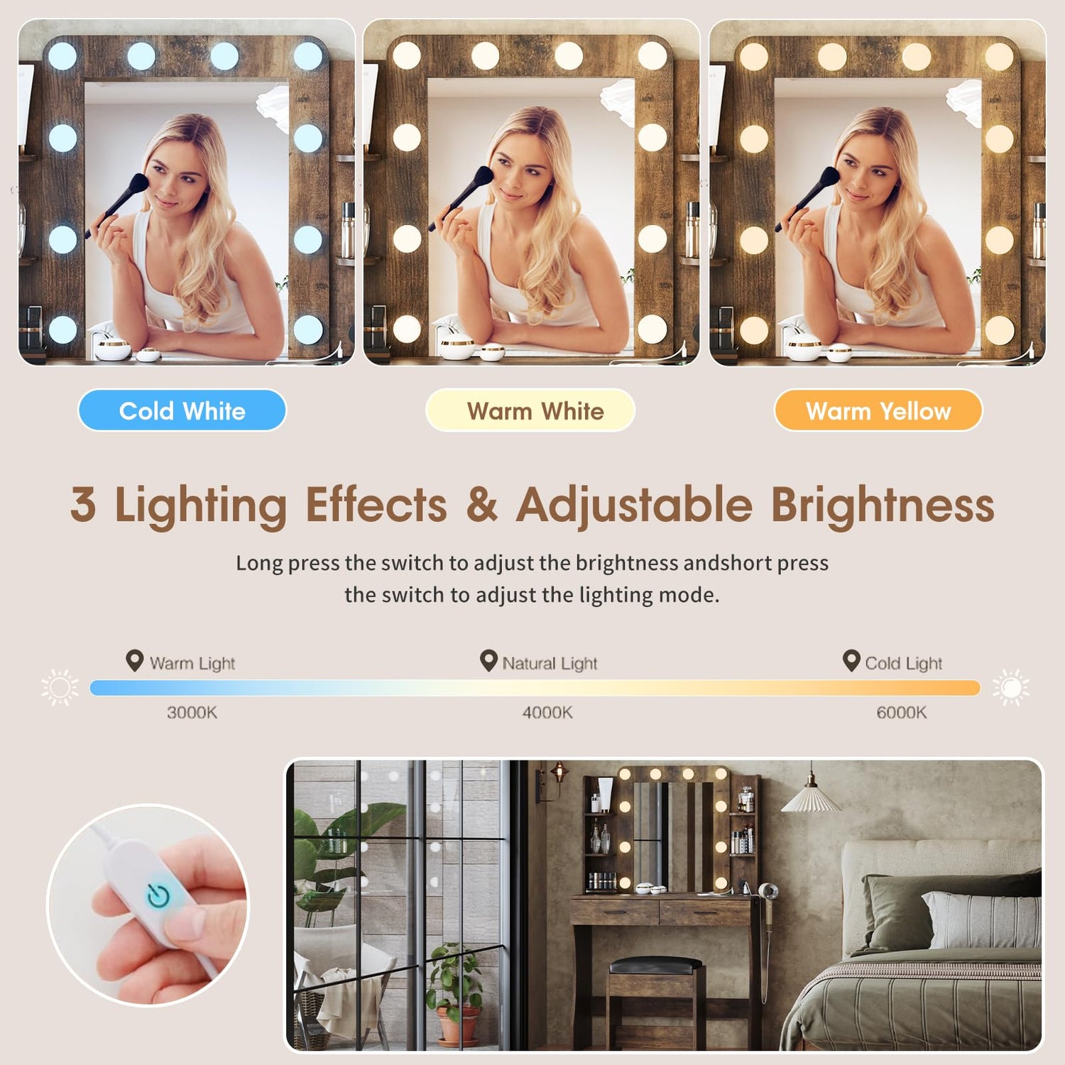 - 【3 Colors Lights with Brightness Adjustable】The vanity with mirror is surrounded by 10 Hollywood light bulbs with 3 color modes (warm/natural/cool) and adjustable brightness, providing a well-lit and clear reflection for easy makeup application or grooming.Suitable for live broadcast, video recording, salon and other activities.