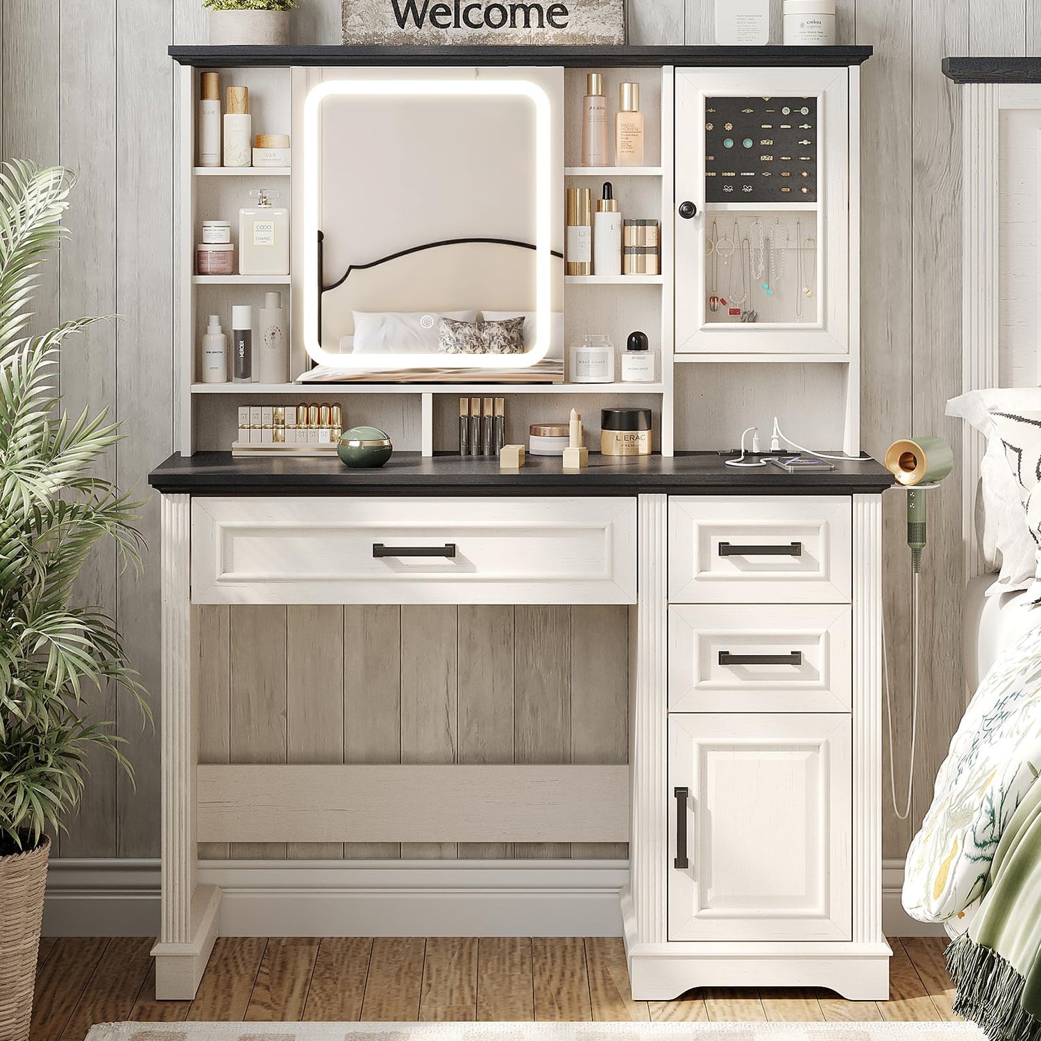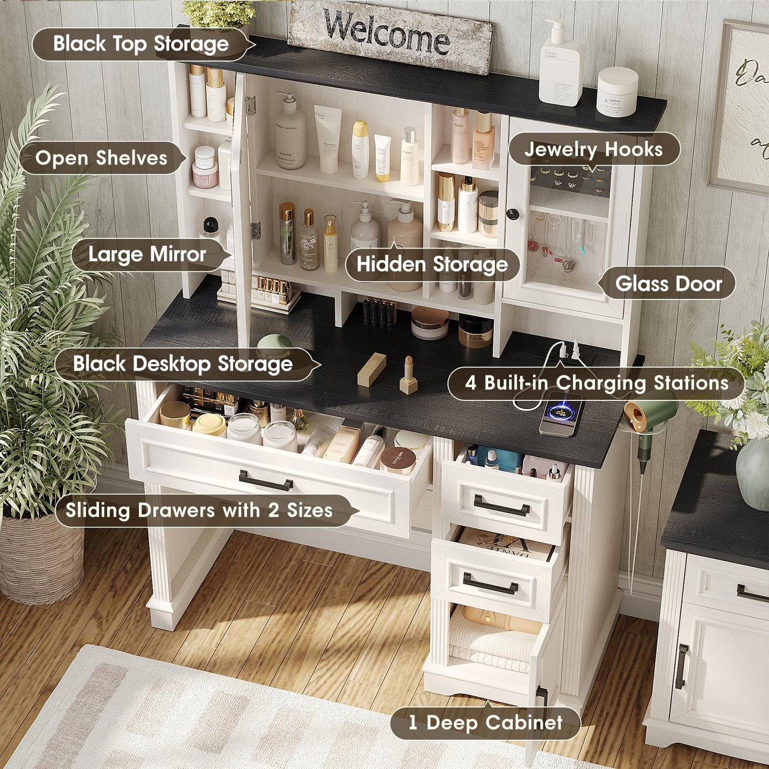 - Powerful Storage Capacity: This white vanity desk includes 3 drawers, a bottom storage cabinet and plenty of open shelves, as well as 2 tiers of hidden shelves behind the mirror, providing plenty of storage space for your cosmetics, jewelry and make-up tools to be sorted and organised. This makeup table features an upgraded design with 2 standard sockets and 2 USB ports, allowing you to easily use your hair dryer and curling iron in front of the mirror
