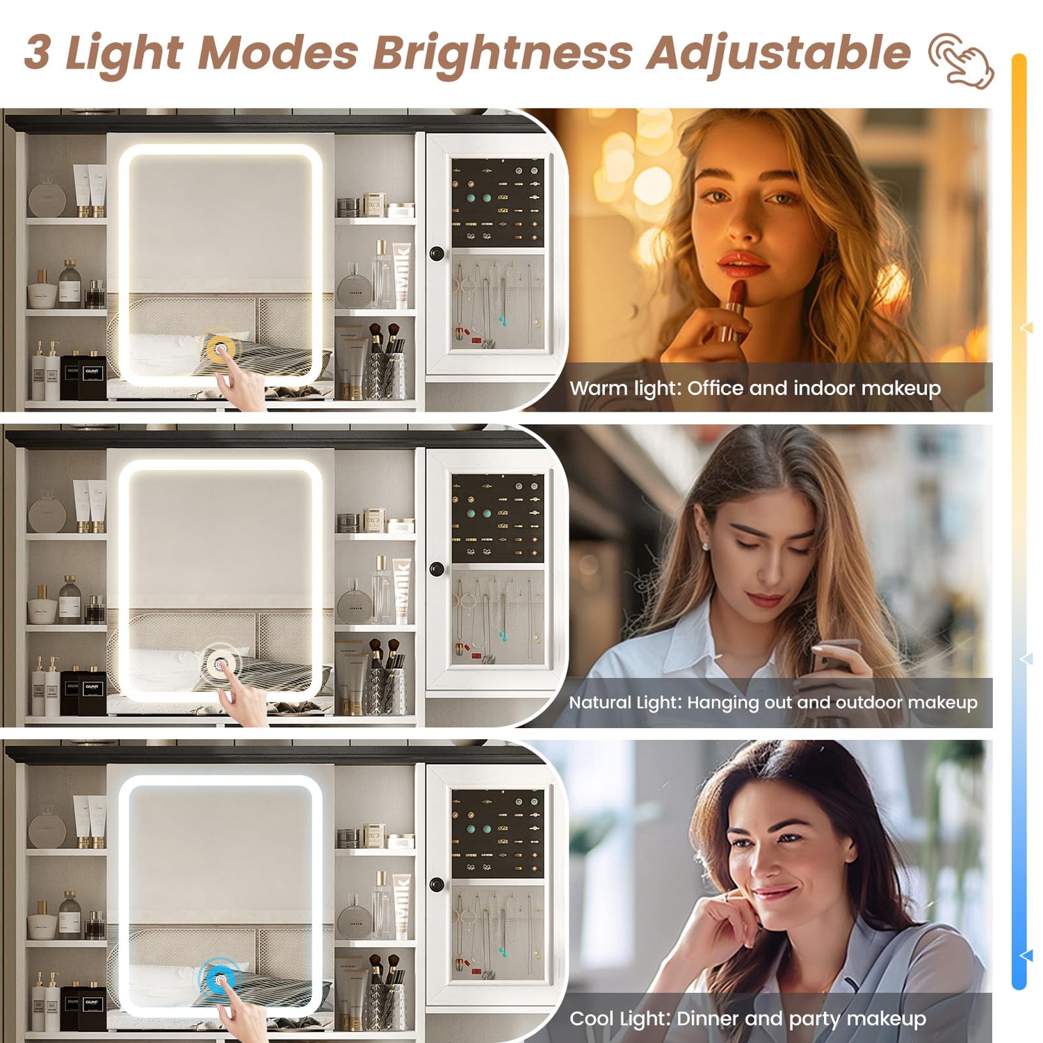 - Lighted Mirror & 3 Color Lighting Options: This vanity table has innovatively integrated a high definition LED mirror and 3 adjustable light modes (natural, warm and cool) allows you to easily change colour modes at the touch of a switch or long press the switch to adjust the brightness. The vanity mirror with lights also features a charging area and hairdryer holder, allowing you to perform flawless make-up, skincare or hairstyling in any environment