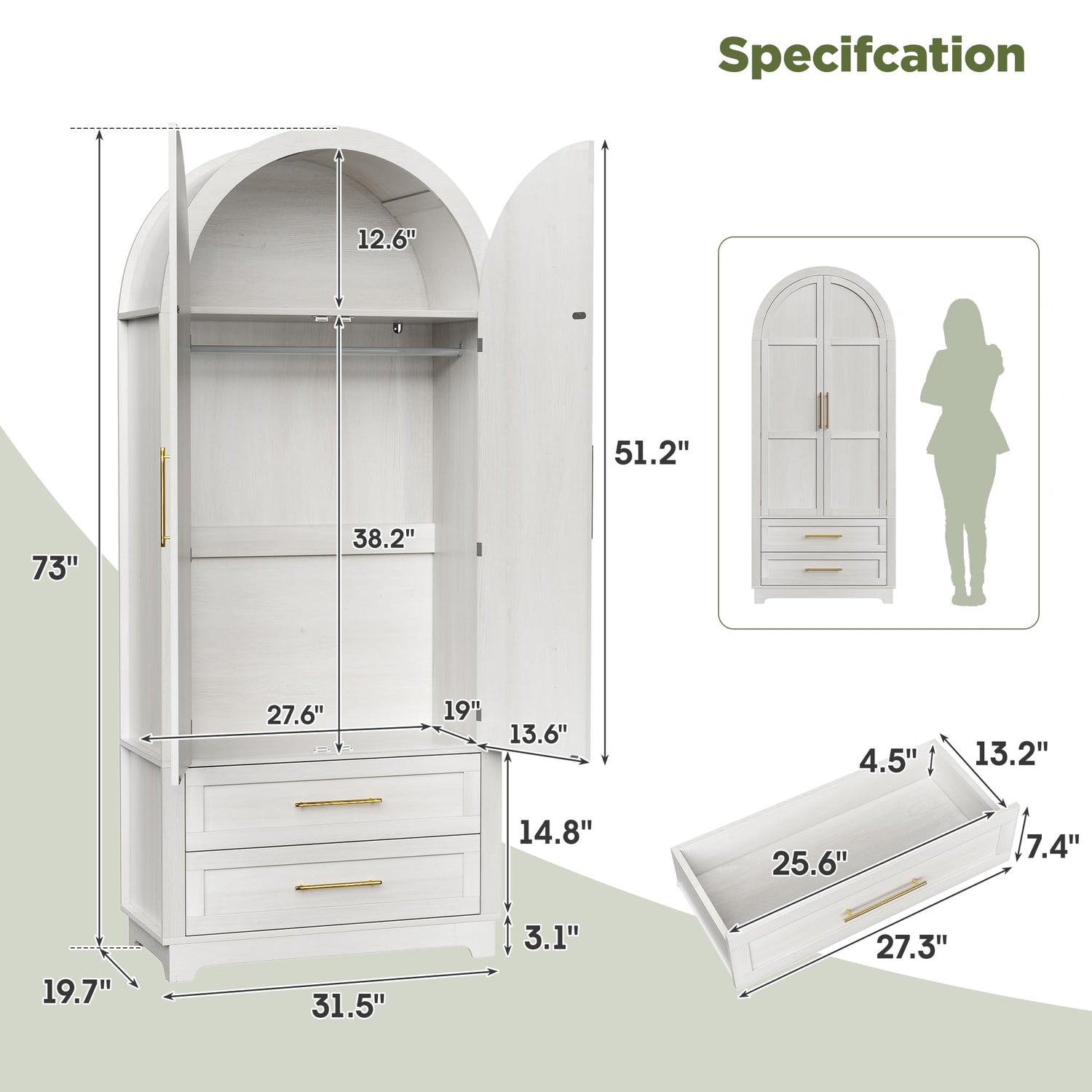 Maupvit Wardrobe Closet, Modern Armoire Wardrobe Closet with 2 Drawers and Arched Doors, 73" Tall Wooden Bedroom Armoires with Shelves and Hanging Rod, White