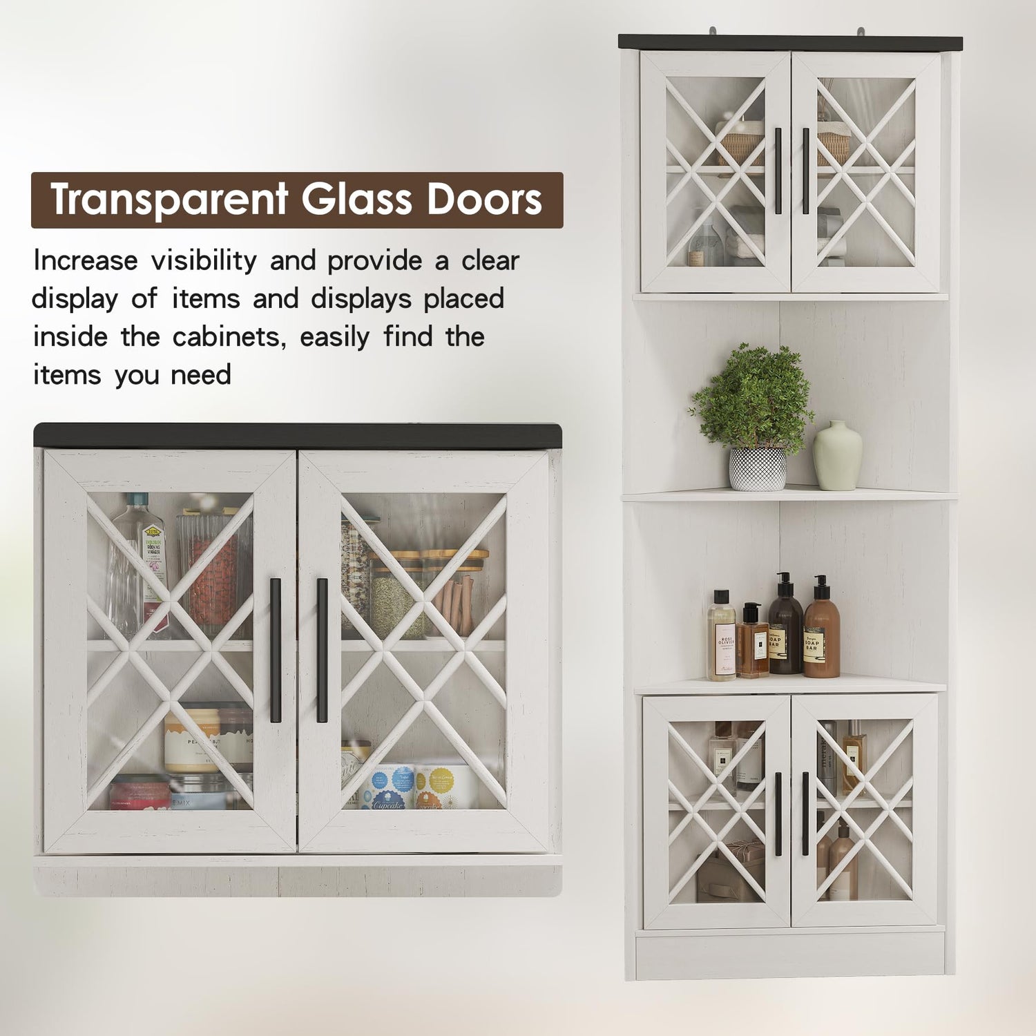 Maupvit White Corner Hutch with 4 Tempered Glass Doors, 67" Tall Farmhouse Corner Storage Cabinet, Kitchen Pantry Hutch with Adjustable Shelf, Home Space Saver for Laundry Room, Dining Living Room