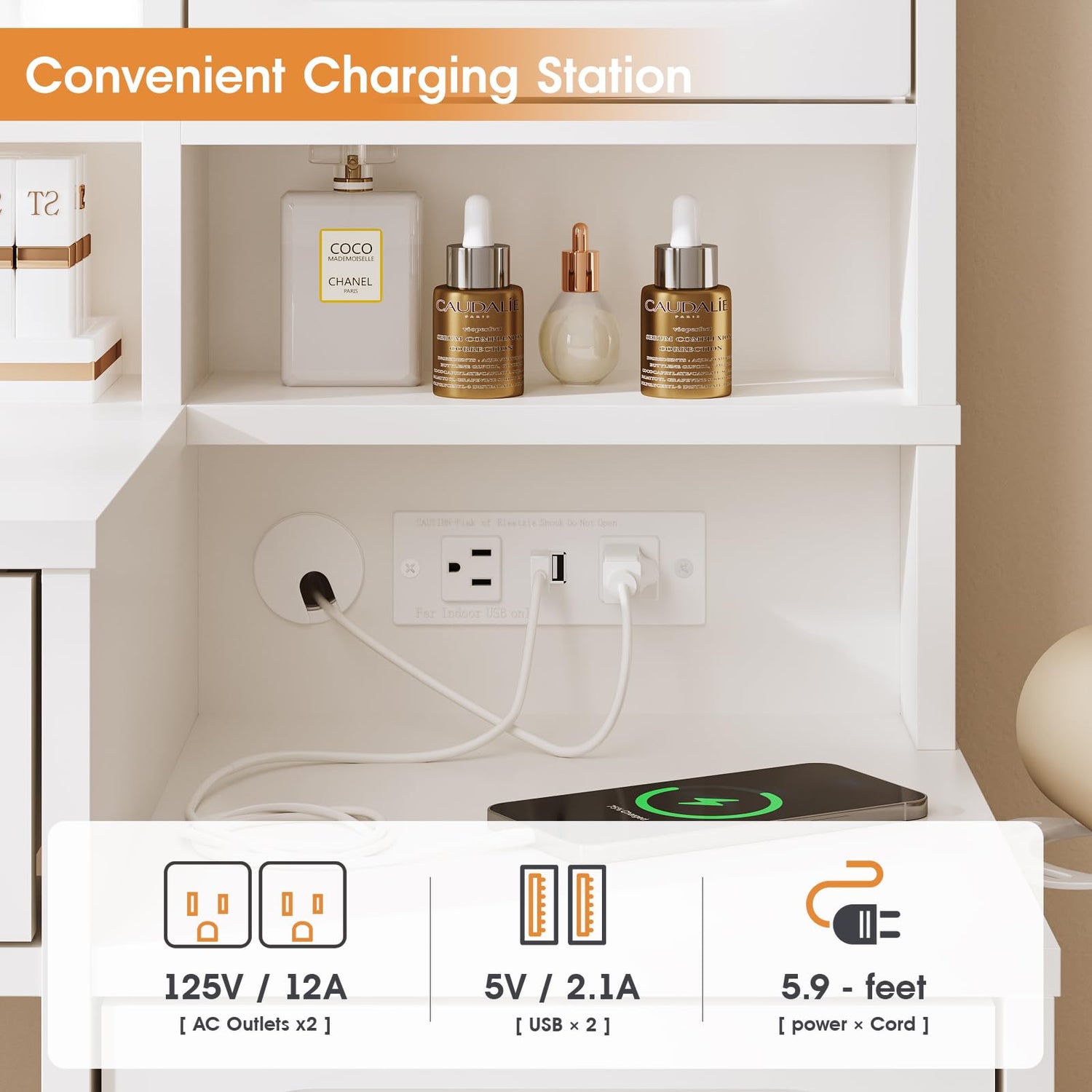 - 【Vanity Table with Charging Station】-This makeup vanity features a charging station, includes 2 standard plug sockets and 2 USB ports, which can be more convenient to connect your hair dryer, curling iron, and it can also charge your phone, tablet or other mobile devices, The unique design is more convenient for you to use.
