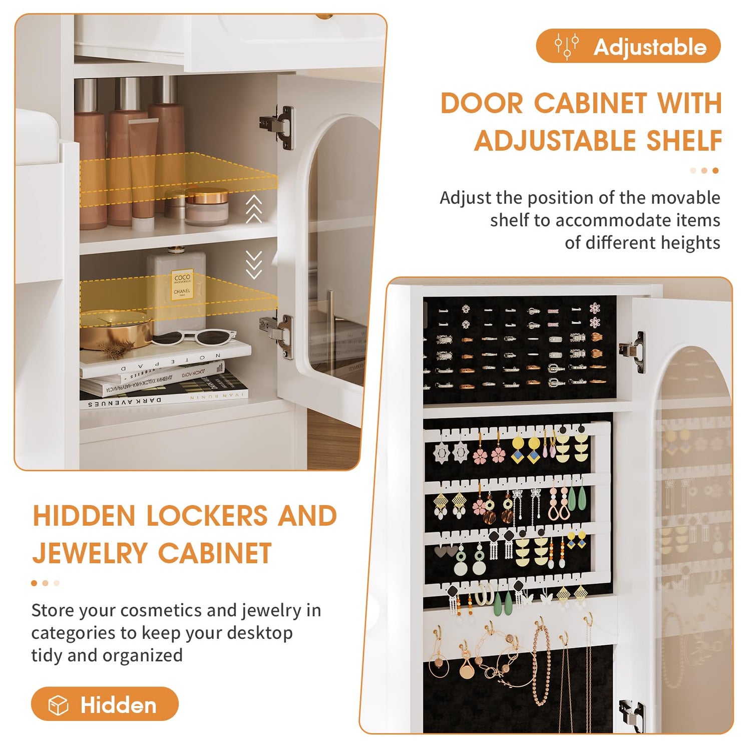 - 【Adequate Storage Space】The vanity is designed with a large drawer(24.8*13.27*4.88), a jewelery showcase and a bedside table.All your cosmetics,jewelery and makeup tools can be sorted and stored neatly to the vanity table. Let you say goodbye to messy storage,It will be a great choice for you.