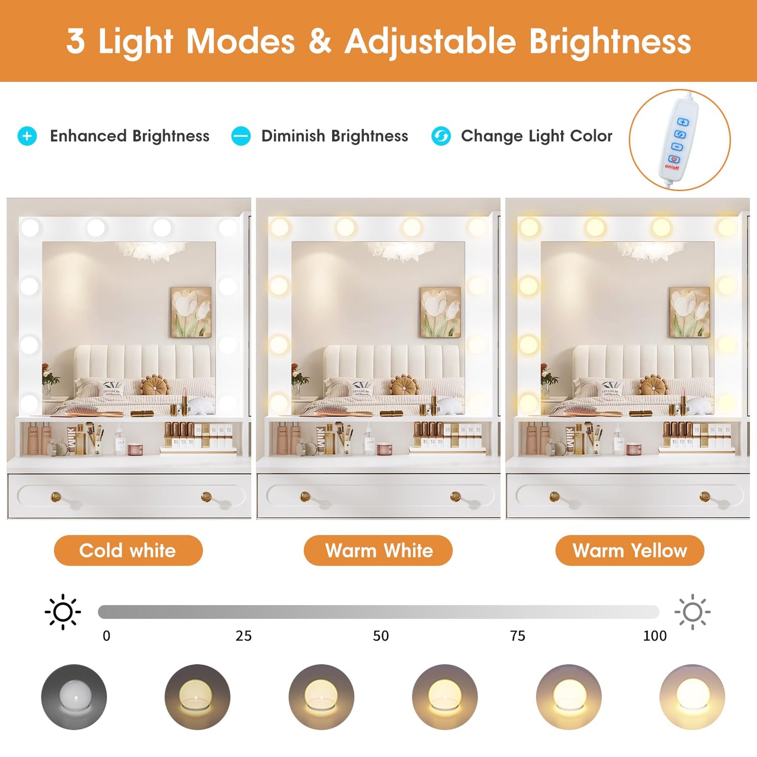 - 【Makeup Vanity with Lighted Mirror】The vanity table is equipped with a large mirror and 10 LED bulbs with 3 color modes to provide you with super-bright lighting, so you can experience the star-like makeup treatment, can more clearly and realistically reflect your appearance, These glam bulbs create the perfect lighting for applying makeup and hairstyling.