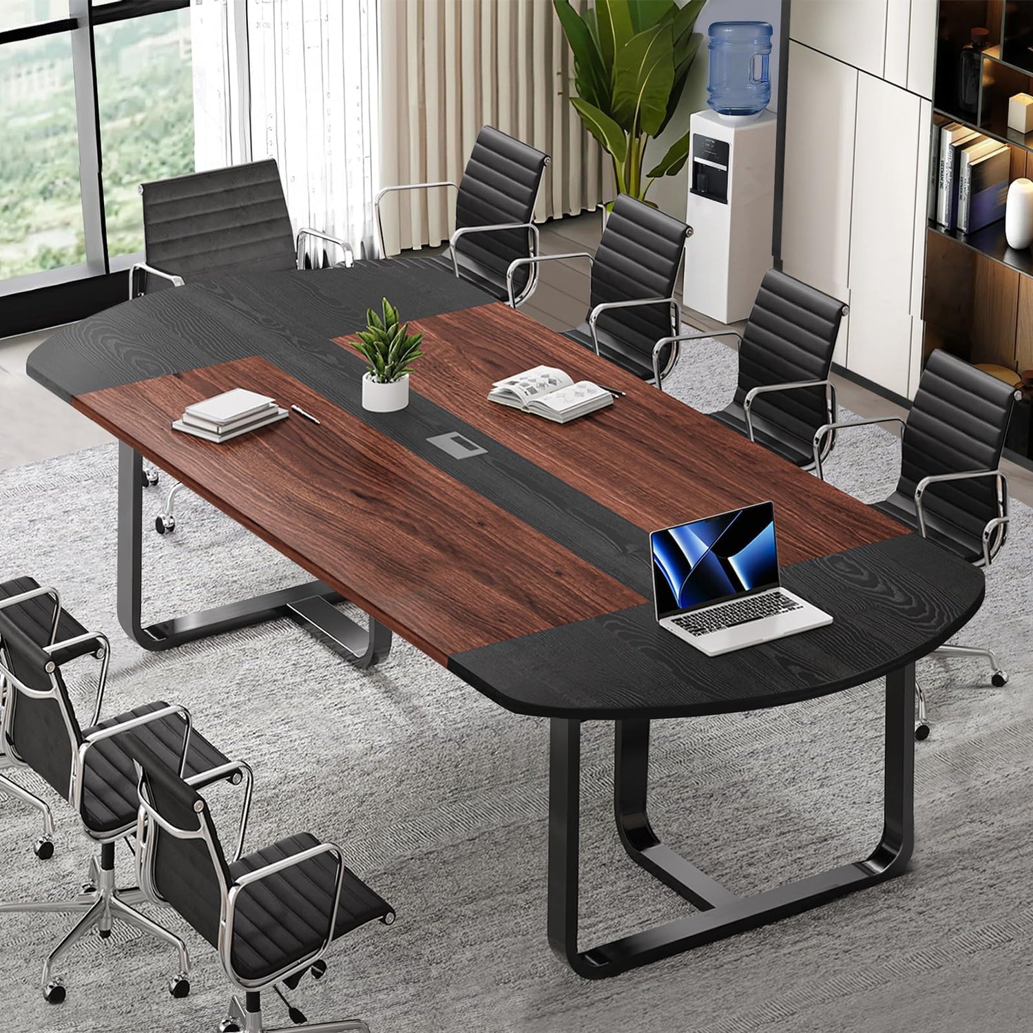 MaverickFurni 8FT Conference Table, Walnut and Black Conference Room Table Curved for Office with Rectangle Grommet, Modern Meeting Table for Office