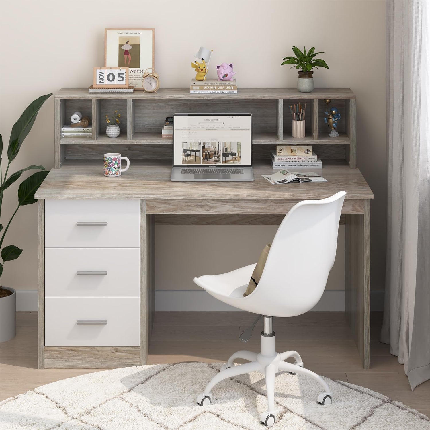 MaverickFurni Walnut and White Desk with 3 Drawers, Small Desk with Storage, Study Desk with Hutch, Kids Desk with Drawers, Wooden Computer Desk for Bedroom