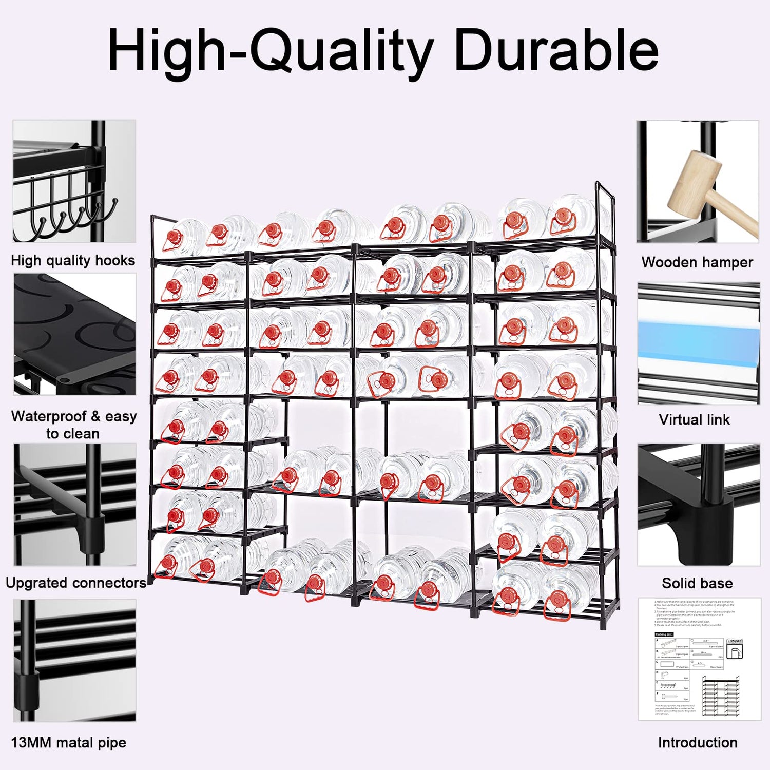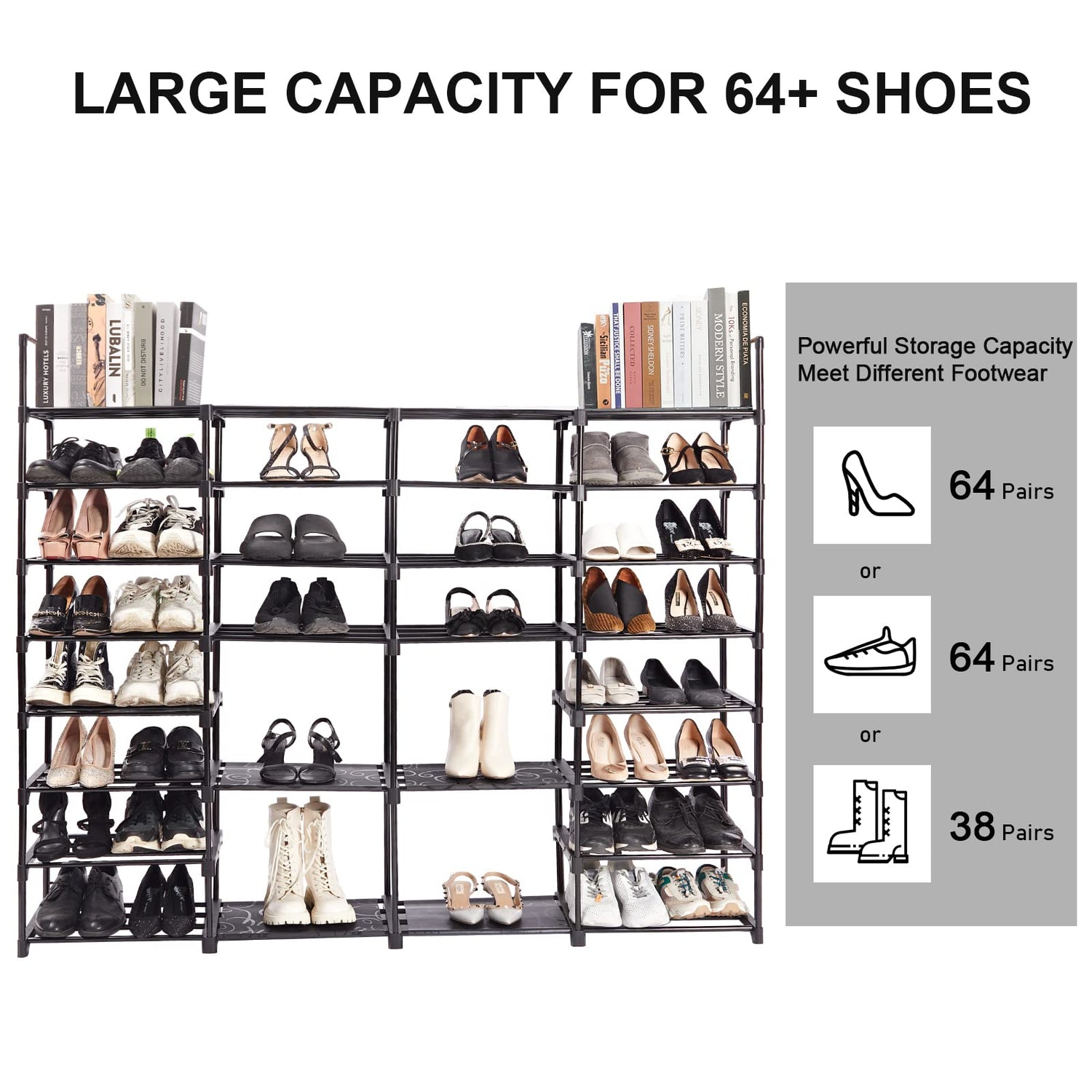 - 【LARGE CAPACITY】Large Shoe rack organizer can hold 64 pairs of shoes, keeping your limited space organized. Shoe racks of different heights are designed to fit boots, heels, shoe boxes or other larger accessories. Shoe rack for closet comes with 10 multifunctional hooks, you can hang a lot of things on it. And with 3 PP sheets, it is waterproof and easy to clean. What a convenient design.