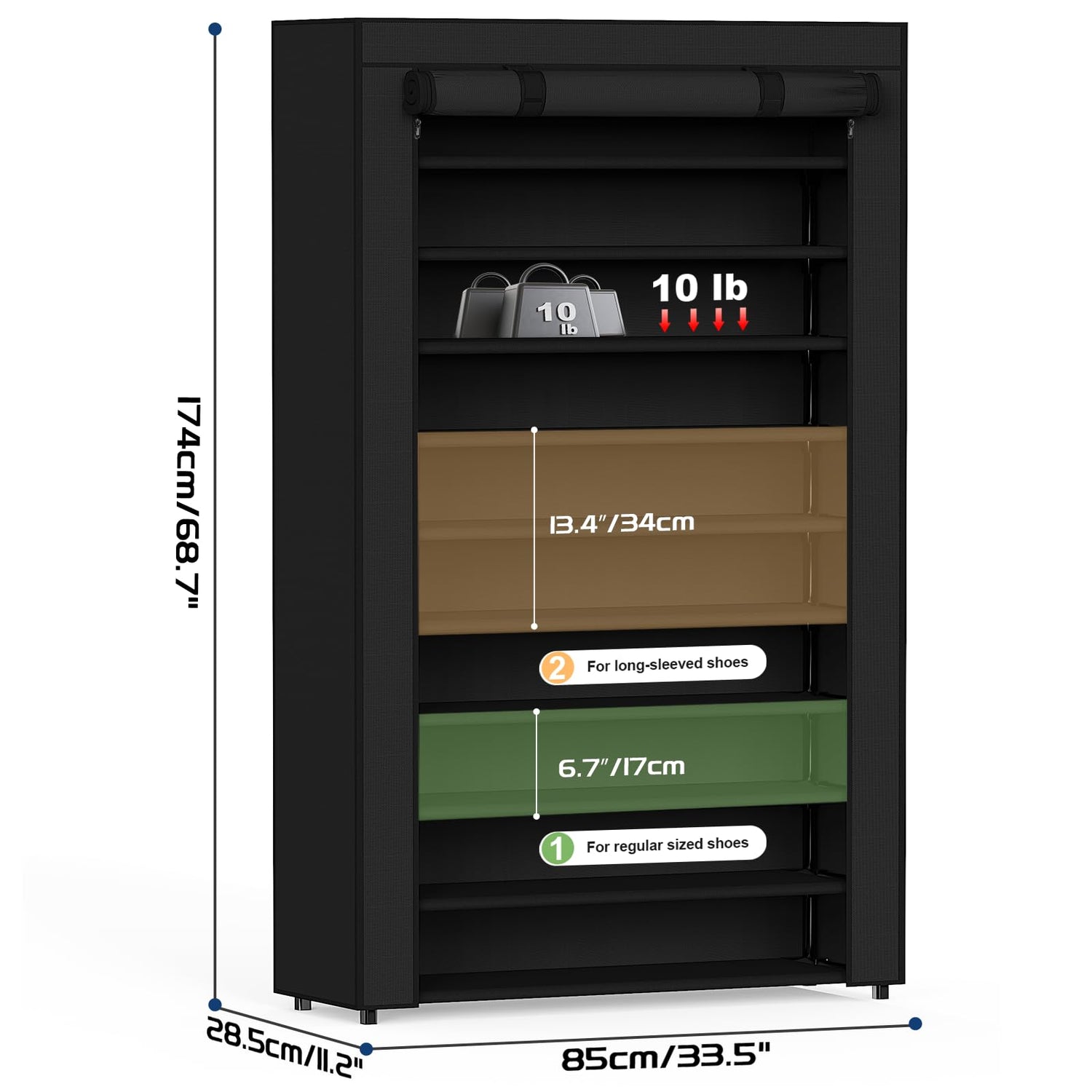 - LARGE CAPACITY SHOE RACK: This 10-tier shoe rack measures 33.5'' W x 11.2'' D x 68.7'' H, offering ample storage space for your shoes. Its design helps keep your floors clutter-free and makes organizing your footwear a breeze