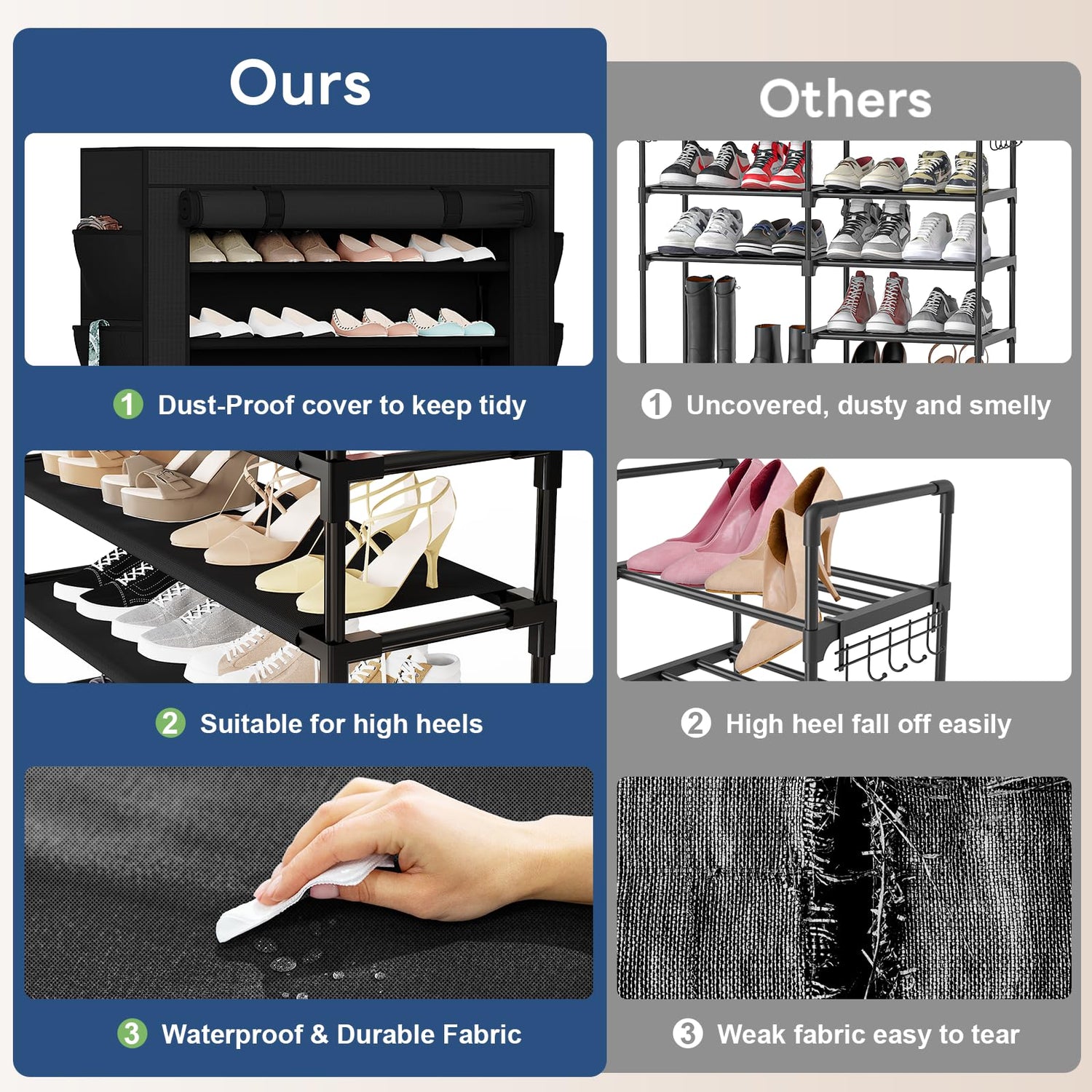 - SHOE RACK WITH DUSTPROOF COVER: This tall shoe rack with cover features a dustproof cover, ensuring your shoes stay clean and protected from dust and pets. The closed design is suitable for maintaining a tidy and hygienic shoe cabinet