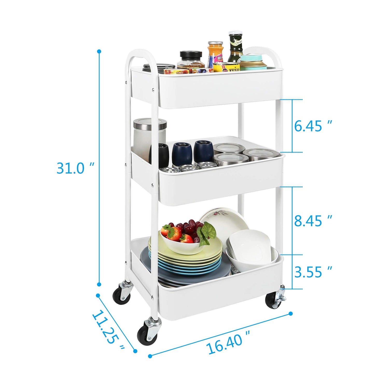 - Perfect rolling carts with wheels: 3 large storage baskets with elevated edges prevent items from falling down when the serving cart is moving. The mesh at the bottom of the baskets ensure efficient airflow, stops liquid to build up and keep your object clean.