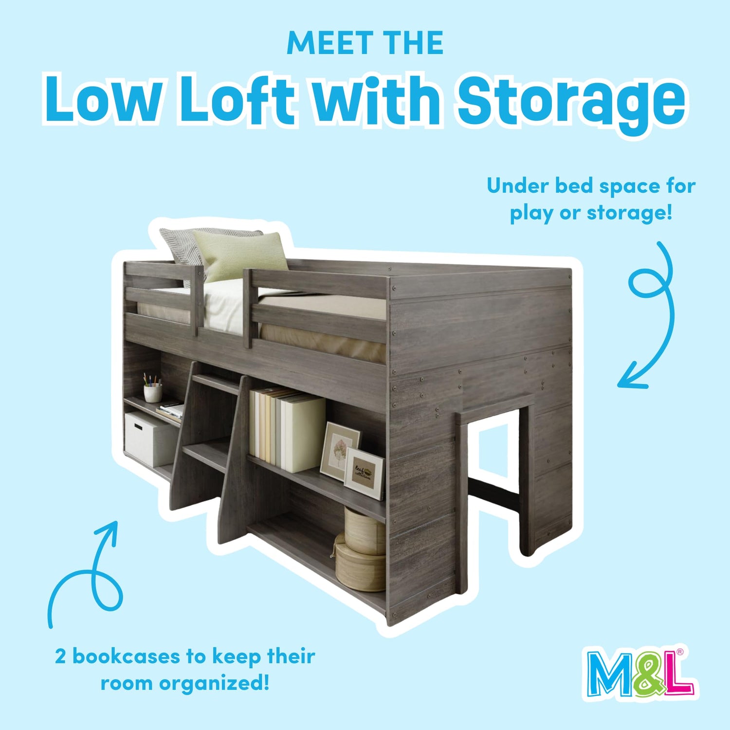 Introducing the Max & Lily Driftwood Modern Farmhouse Low Loft Bed with 2 Bookcases, the perfect blend of style, functionality, and safety for your child's room. Designed with a charming distressed finish, this low loft bed features rounded corners and edges, enhancing not just its appeal but also its safety for little ones.