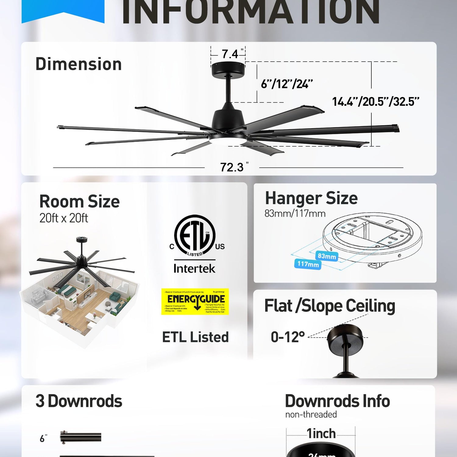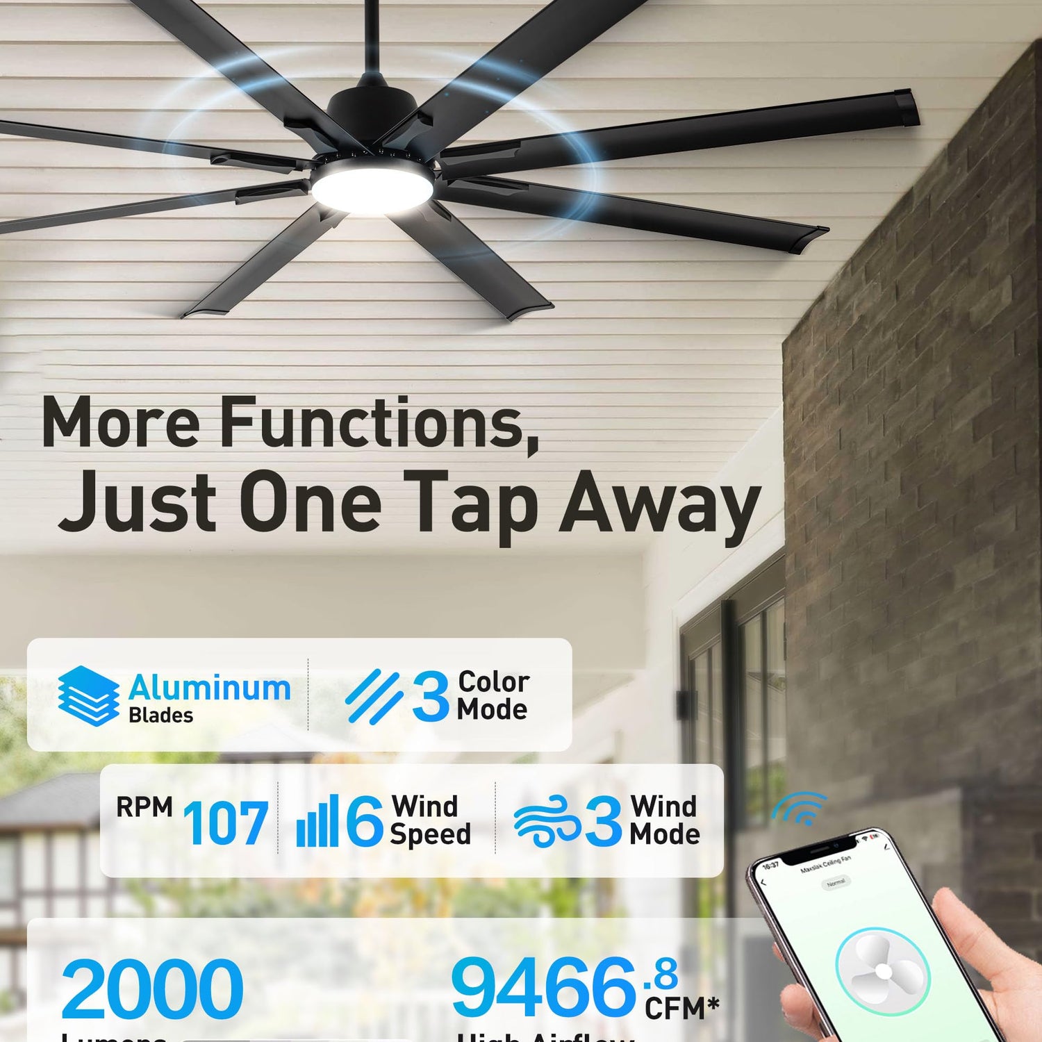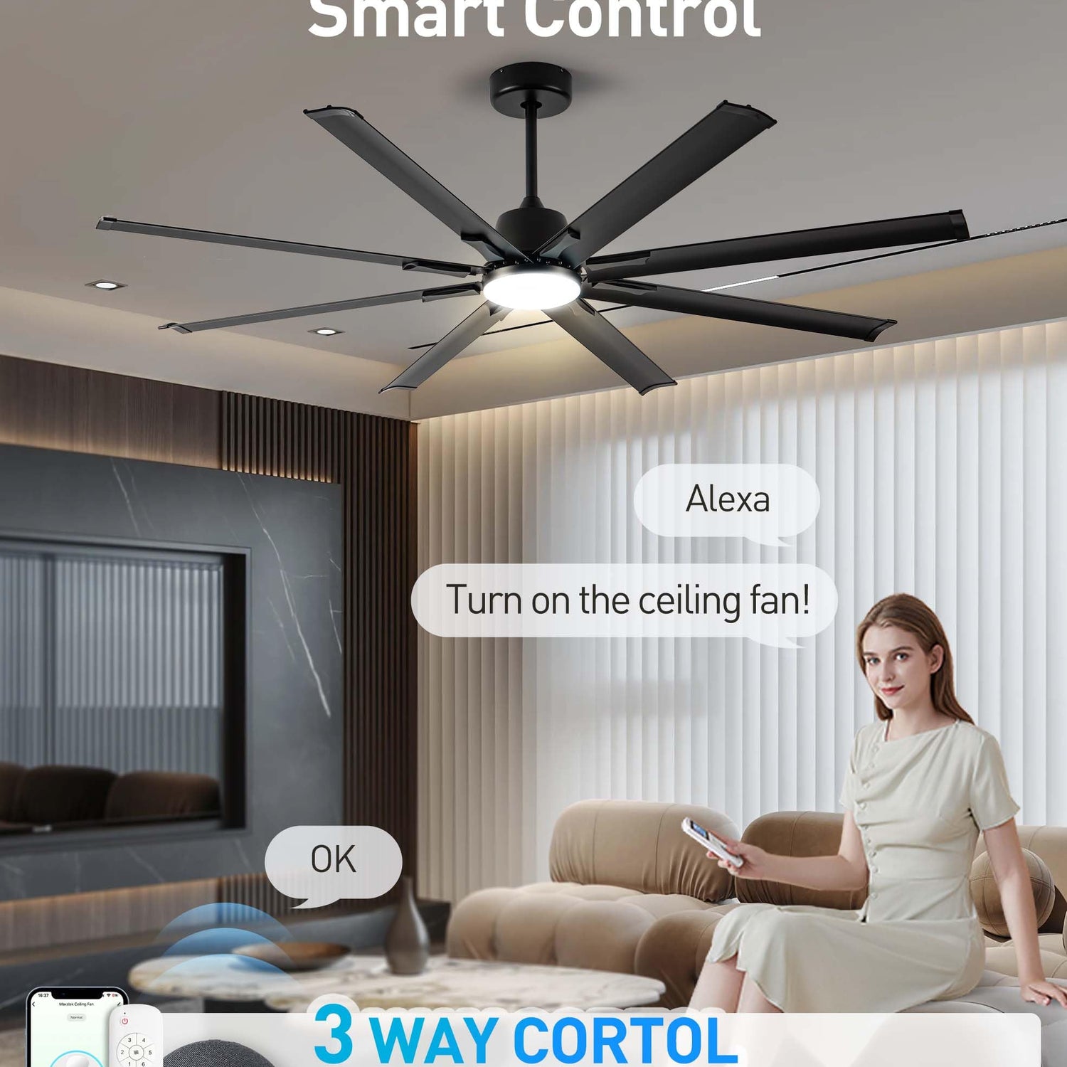 Maxslak 72 Inch Ceiling Fan with Light,Industrial Ceiling Fan with 8 Black Aluminium Blades,Smart Fan Works with Alexa,Garage Outdoor/Indoor Fan for Patio and Living Room