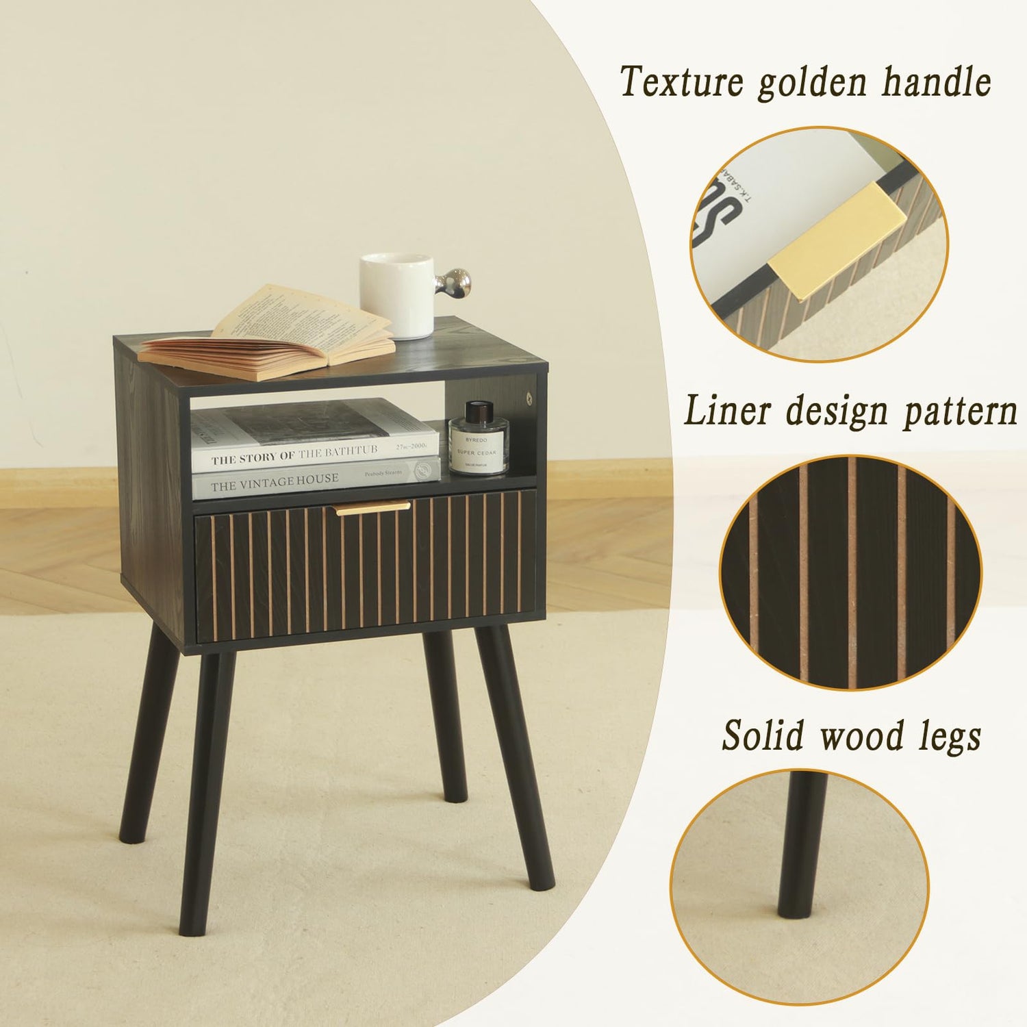 MaxSmeo Black Nightstand with Drawer, Mid Century Modern Bedside Table with Open Shelf Storage, End Table with Solid Wood Legs, Black