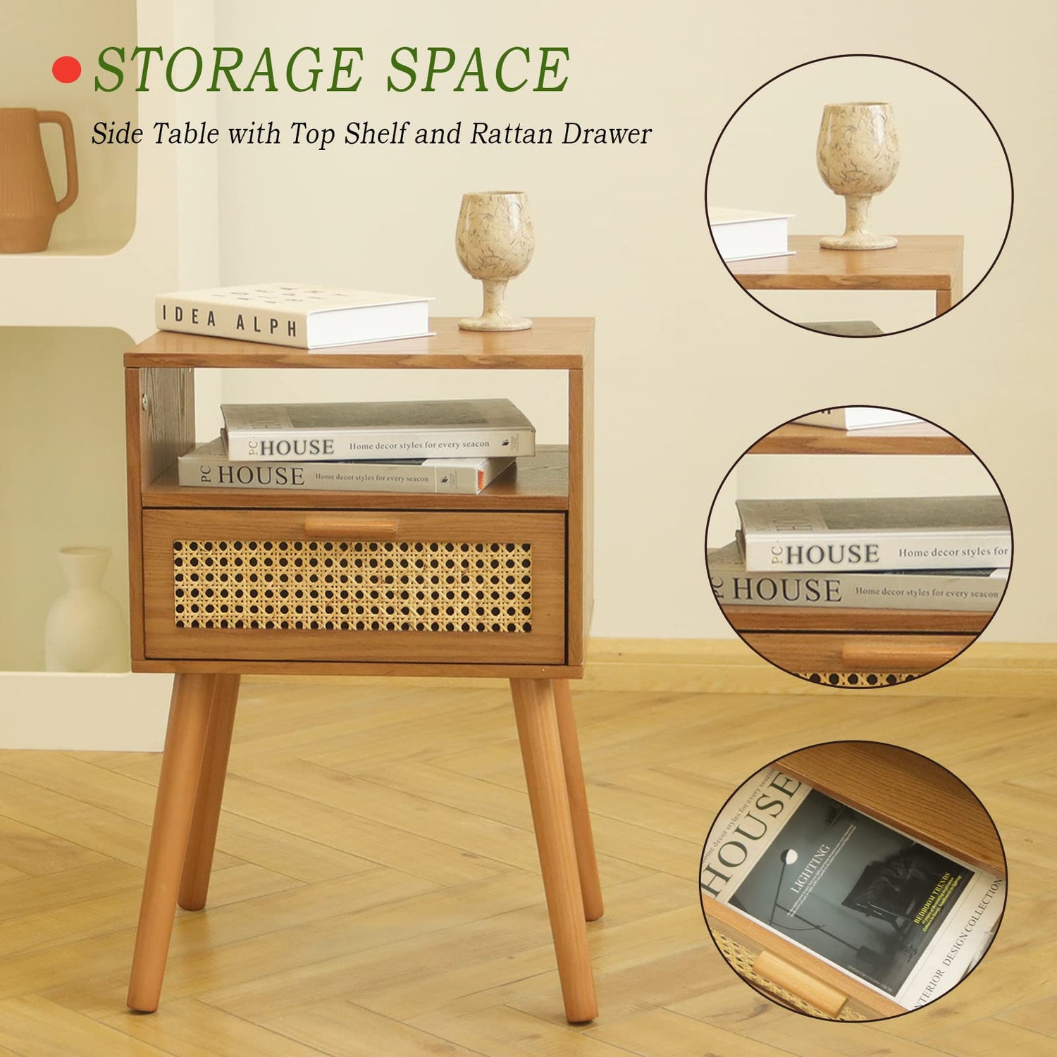 MaxSmeo Mid Century Modern Nightstand with Drawer, Small Nightstand Bedside Table, Brown Rattan Nightstand, Wood End Table for Bedroom, Living Room (Brown)