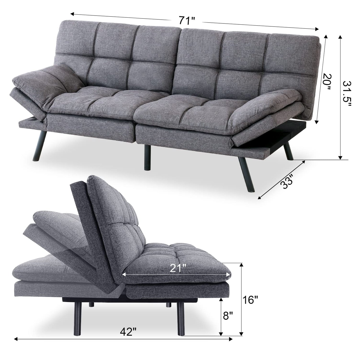 • 【Perfect For A Small Space】 Futon sofa dimensions: 71" L x 33" W x 31.5" H; Sleeper bed dimensions: 71" L x 42" W x 16" H; The design of the sofa is a classic modern simple style. This multifunctional sofa bed can be placed in different room types, living room, bedroom, office, dormitory, RV and other small spaces.