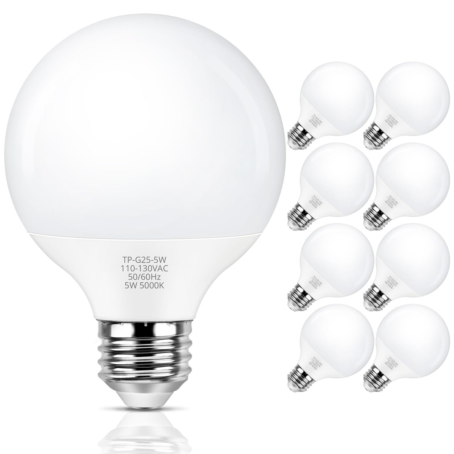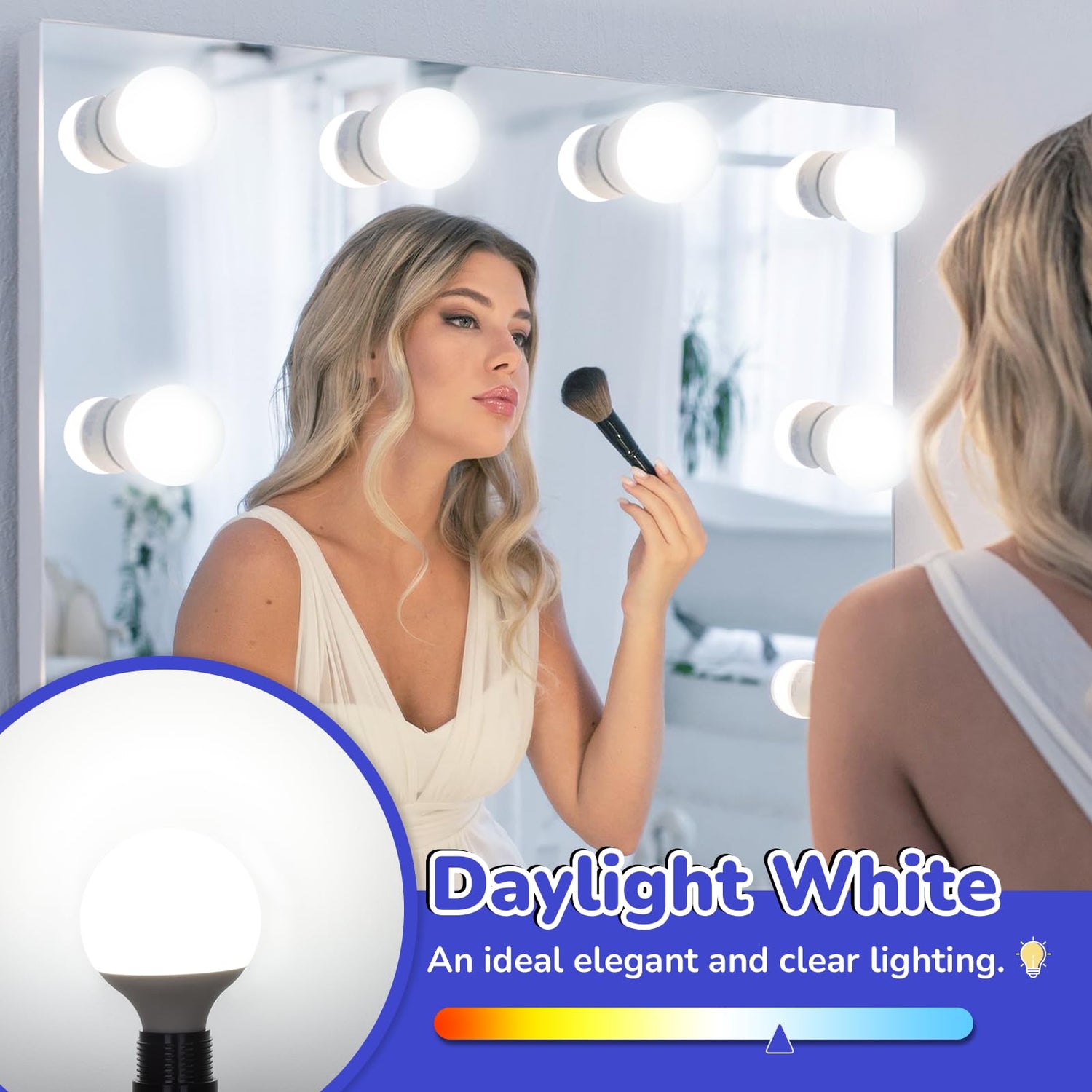 - Globe Light Bulbs Daylight White Lighting 5000K: G25 led light bulbs simulate bright morning sunlight, providing elegant and clear lighting that helps you save time on your daily makeup routine. These globe vanity light bulbs with vivid and bright lighting are the perfect choice for replacing bathroom or makeup mirror bulbs