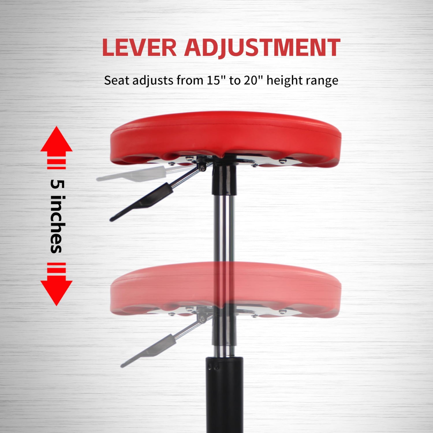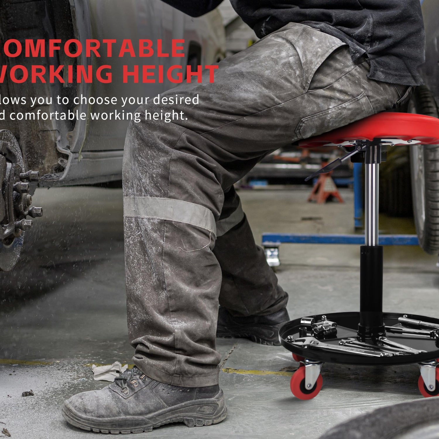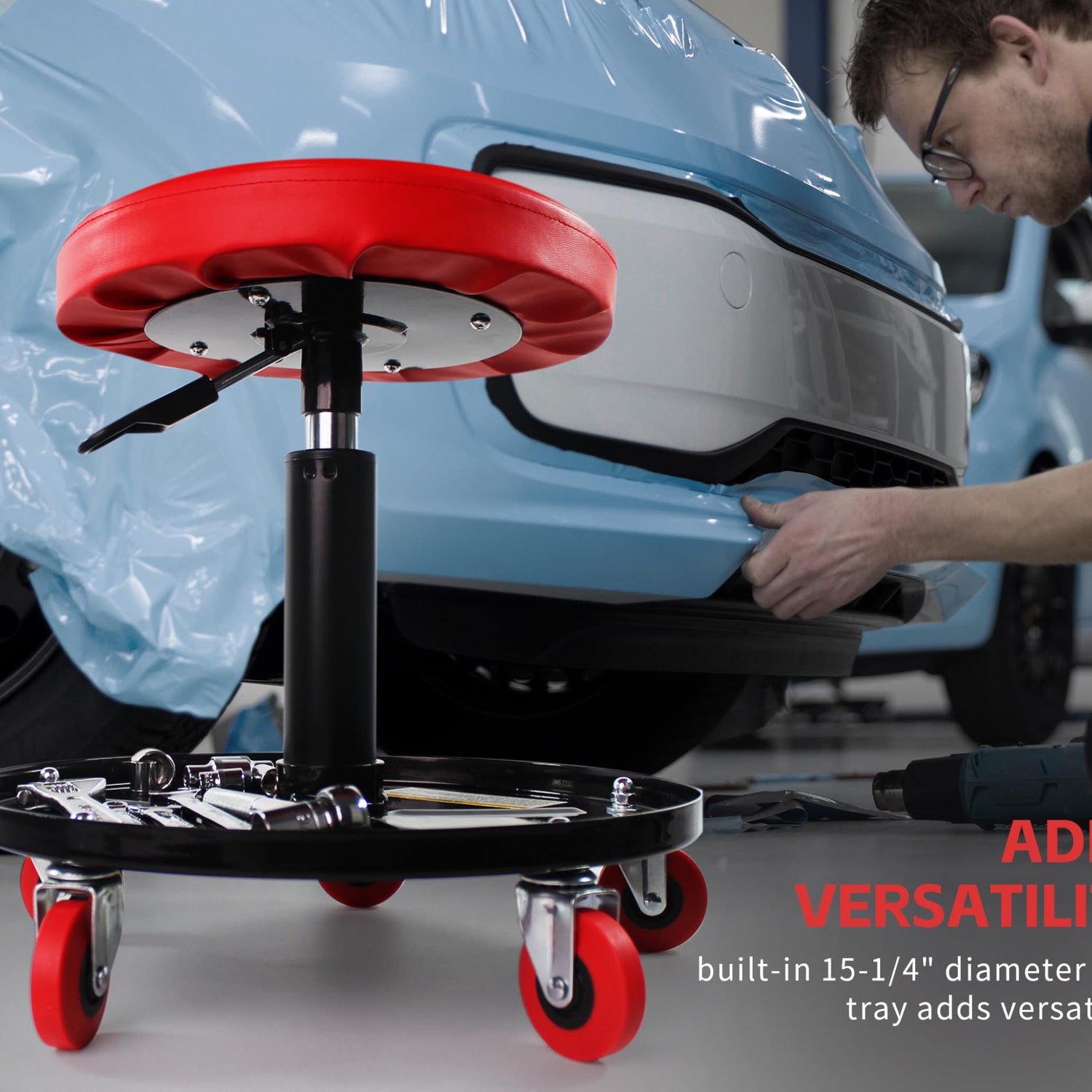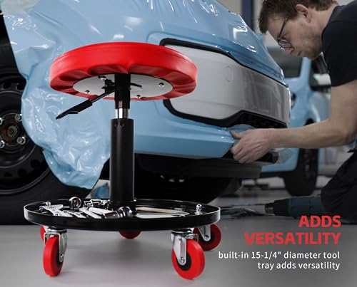 Details: Our MaxWorks Adjustable Roller Seat/Creeper features a pneumatic cylinder that allows you to choose your desired and comfortable working height with simple side lever adjustment. Includes five 2-1/2" diameter non-marring swivel castors that roll easily under load. Thick and comfortable seat cushion with built-in 15-1/4" diameter tool tray adds versatility. The seat has a height range of 15" to 20" and rated up to 300 lb. maximum capacity. This chair is a must for your garage whether you are waxing your wheels or detailing your car or filing paper work in your office.