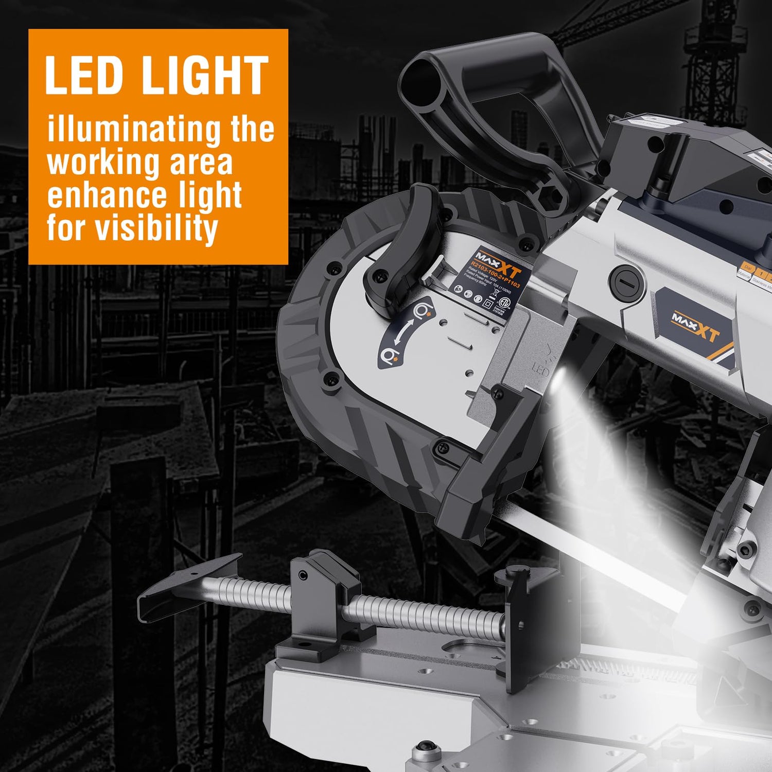 - 【Safety Comfort and Auto Cut-Off】We prioritize your safety and comfort. The Portable Band Saw features an emergency switch and auto-stop function, providing additional safety measures. The automatic cutting function allows you to enjoy the convenience that automatically stops running once the cut is completed. The self-locking switch prevents accidental activation, making it safer to use. The ergonomic soft grip on the back ensures a comfortable hold during extended use. The tool-free saw blade change lever allows for easy and quick blade changes, minimizing downtime and maximizing efficiency