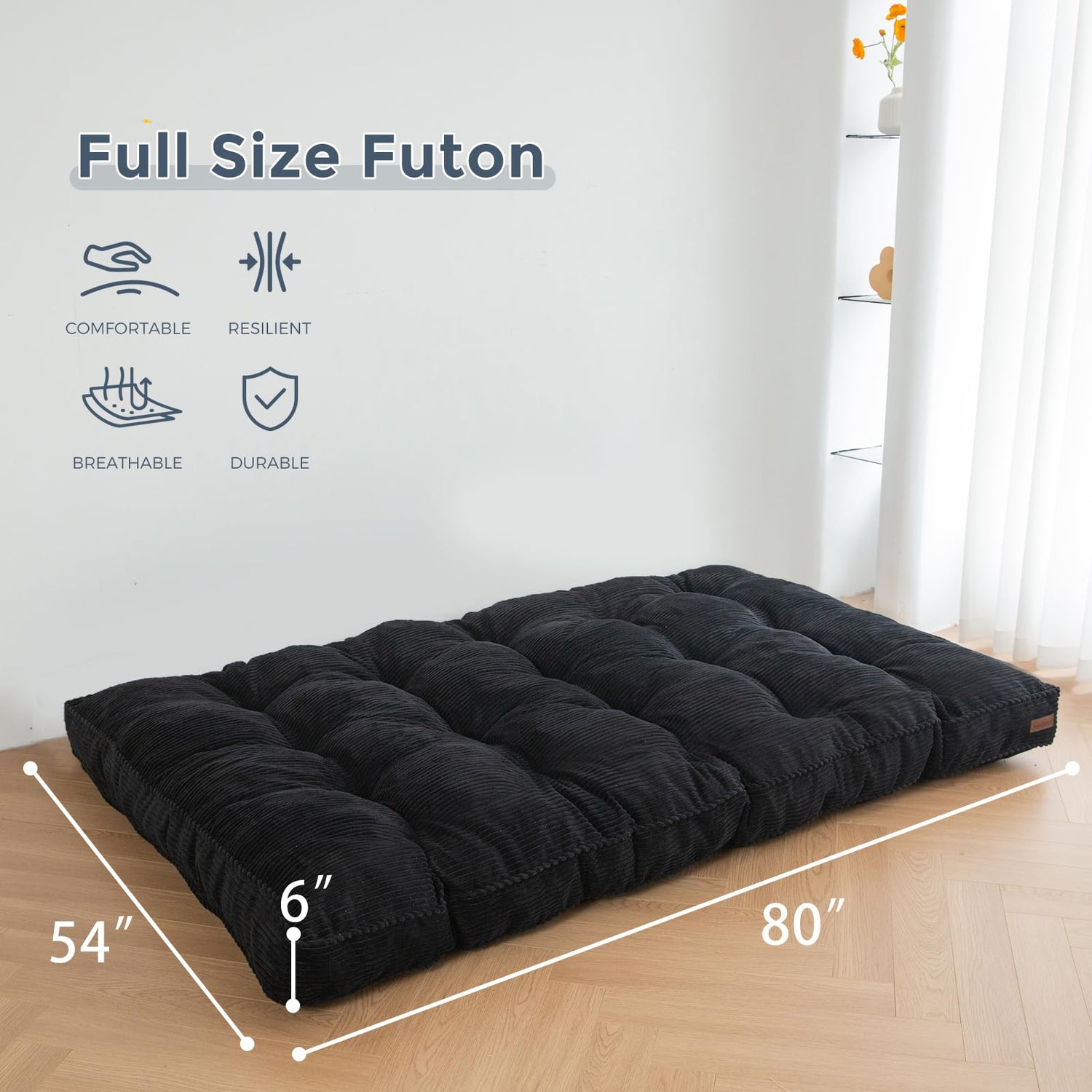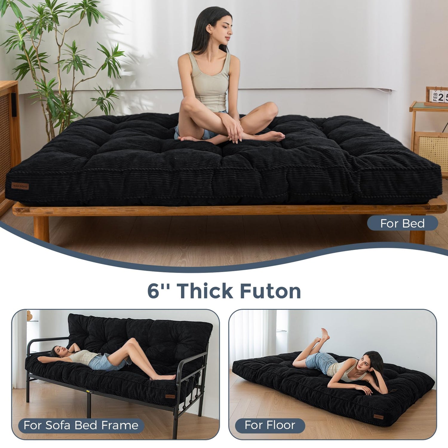- Versatile & Thick Futon : The thickness of the futon is about 6 inches, which provides a comfortable sleeping surface with ample cushioning and support. It is suitable for use on futon frames or as a mattress on its own on the floor. The futon is filled with high-density shredded foam. The corded fabric adds a touch of style and comfort to the futon, making it a stylish and inviting addition to your home furnishings