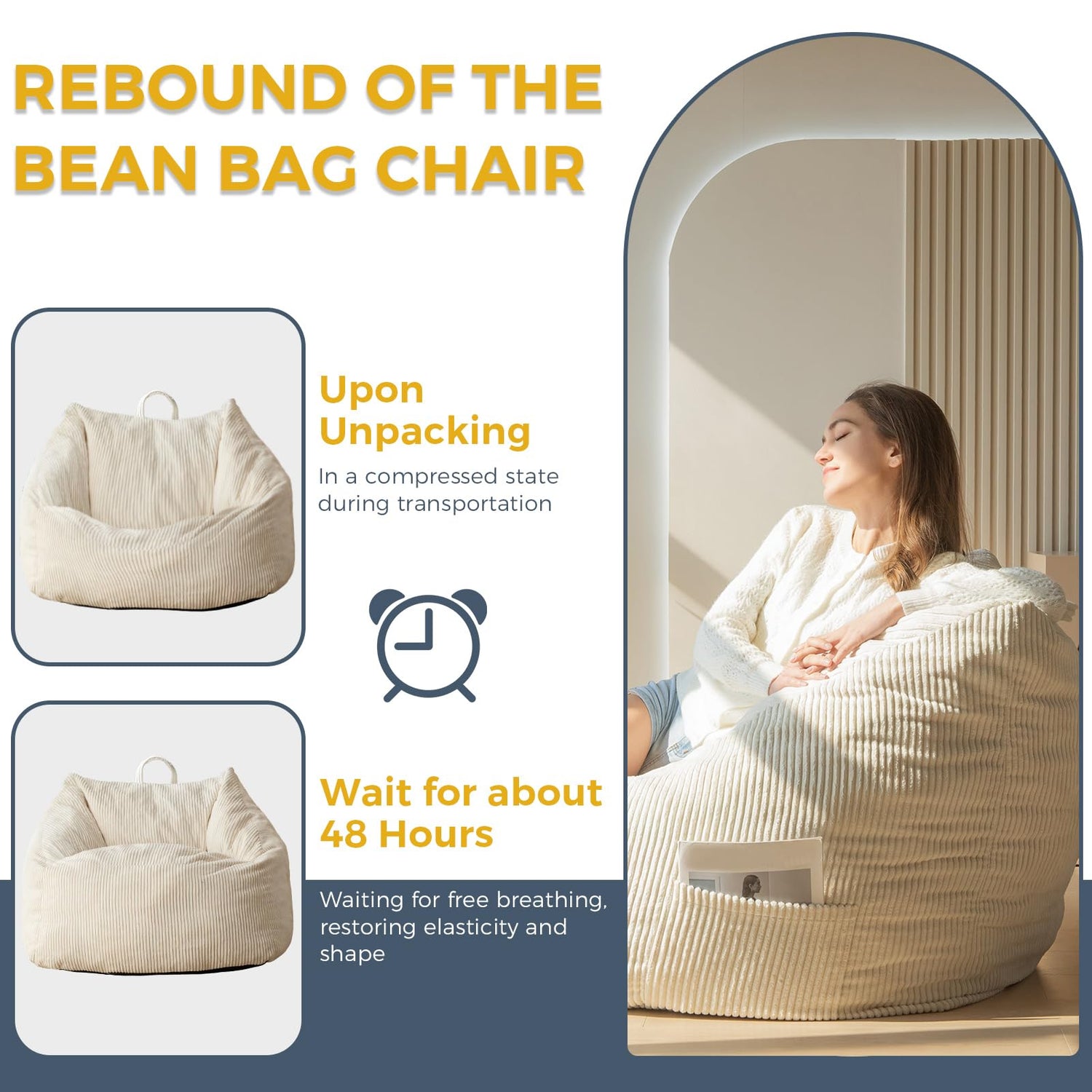 - No Assembly: The bean bag chair is pre-filled, you do not need to fill it yourself. It is shipped compressed and needs to be cut open and packaged, tapped and shaken to promote rebound, and waited about 48 hours to return to its original shape. If you have any questions, please to contact us at any time, we will be at your service 24 hours a day!