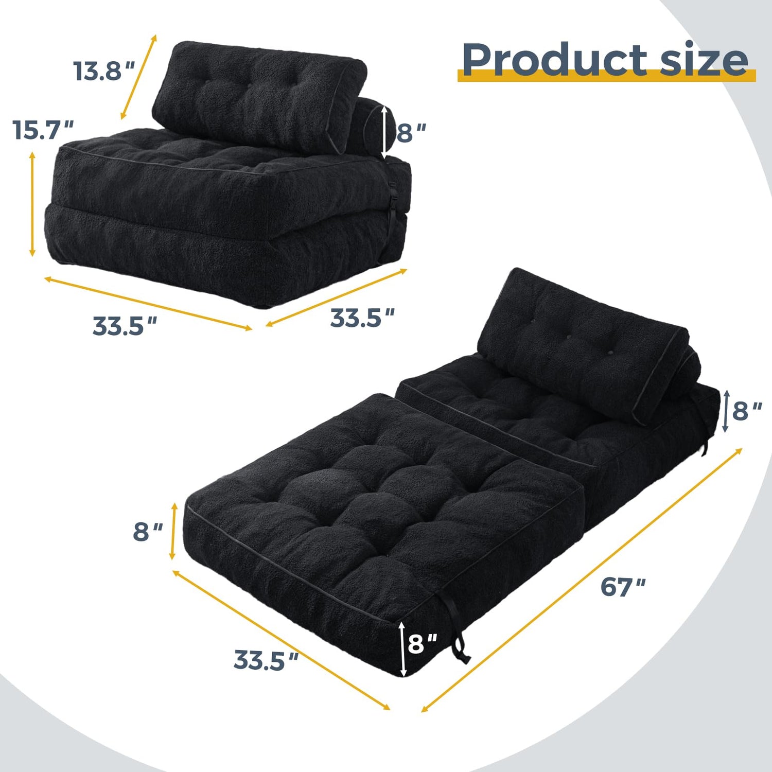 • Durable Fabric: Crafted from premium fuzzy fabric, this material offers a unique visual and tactile experience, elevating the ambiance of your living space. The size of the folding sofa bed is about 33.5"x74.8", which would be tailored to provide comfortable seating or bed for one person