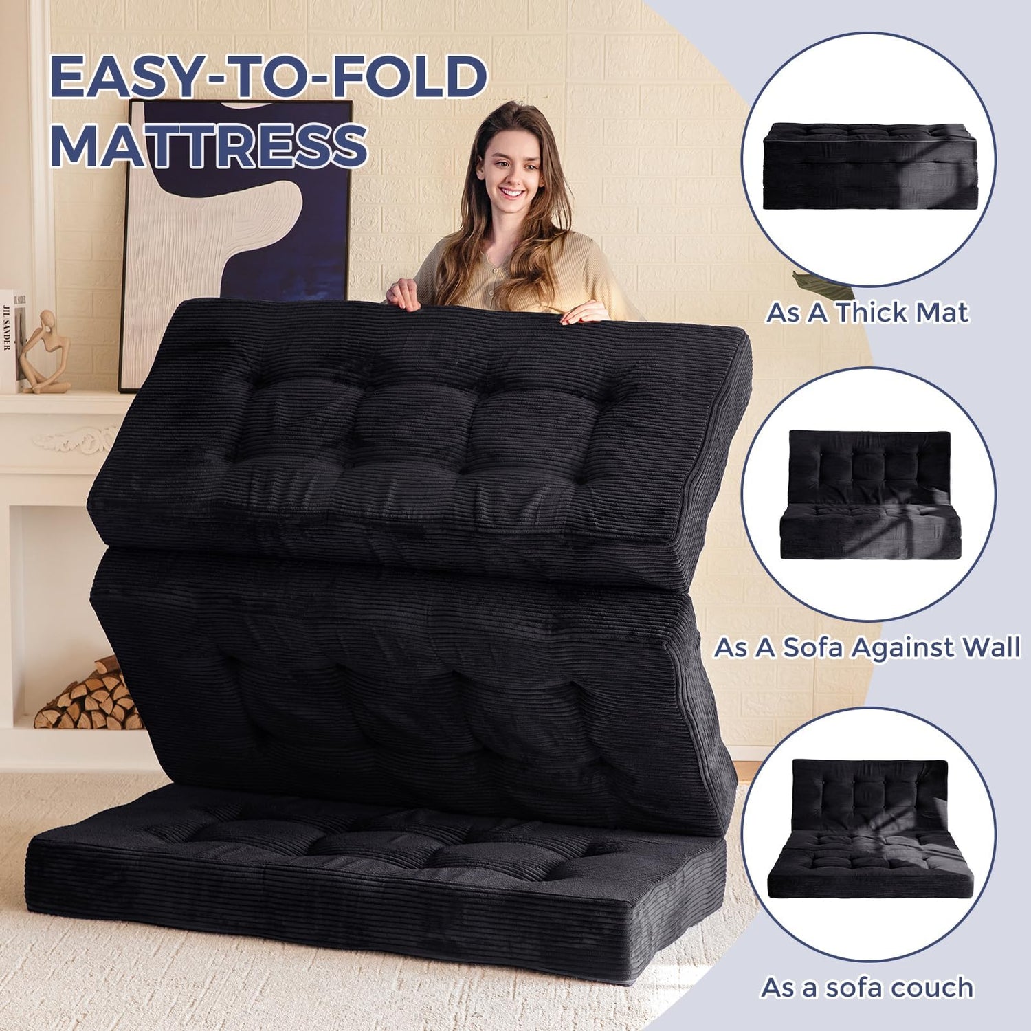 MAXYOYO Tri-Fold Mattress, 6 Inch Tufted Folding Futon Foam Bed, Foldable Floor Mattress Guest Bed Futon Topper Portable Camping Sleeping with Corded Fabric, Black, 59"x79"